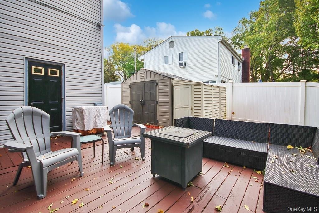 - Wooden terrace with an outdoor living space with a fire pit and a storage shed