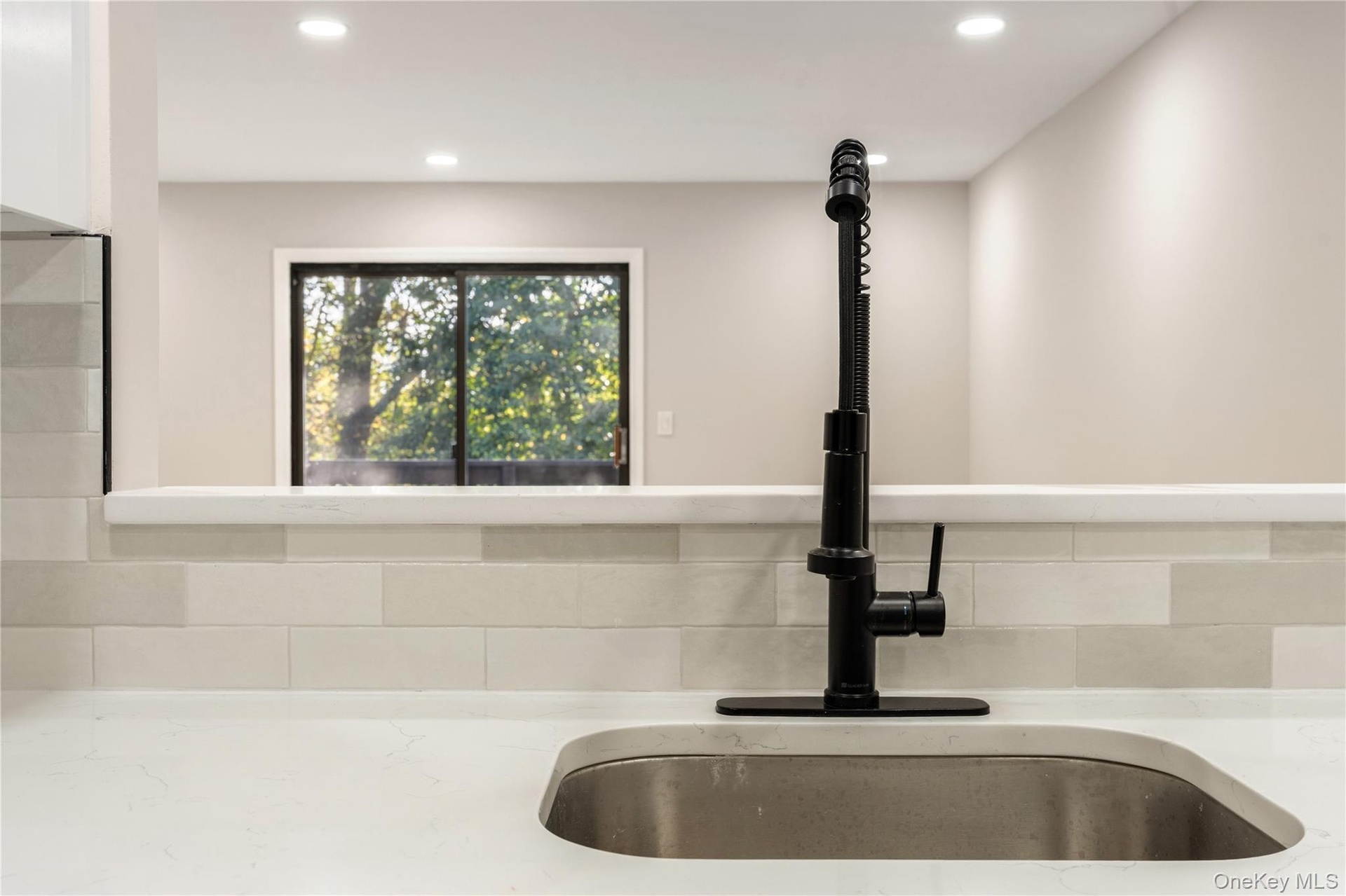 - Kitchen view of decorative backsplash, recessed lighting, and light stone countertops