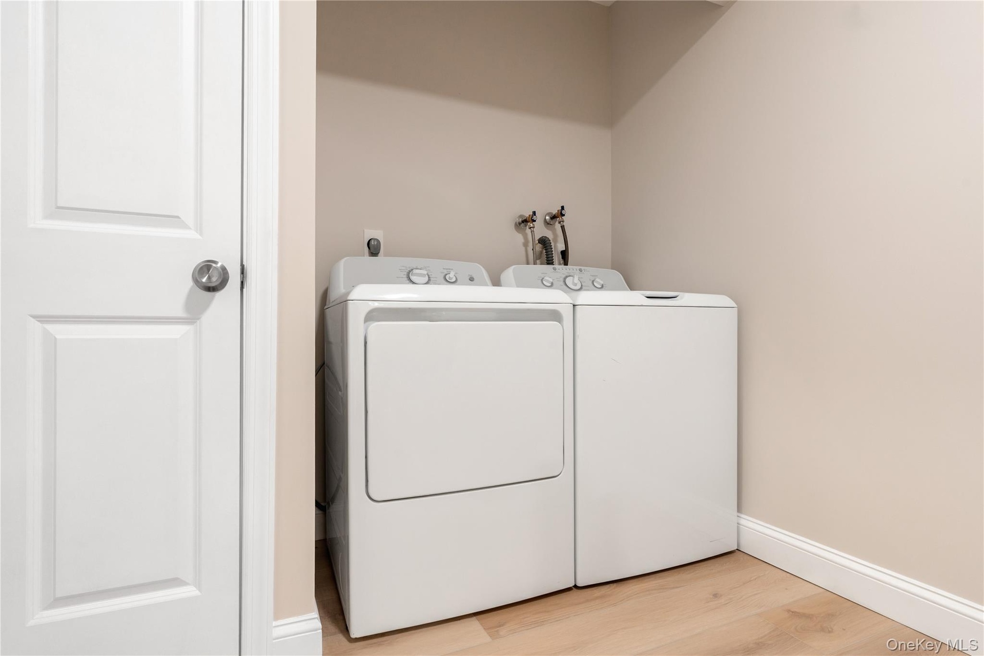 - Laundry area featuring light wood-style flooring and independent washer and dryer