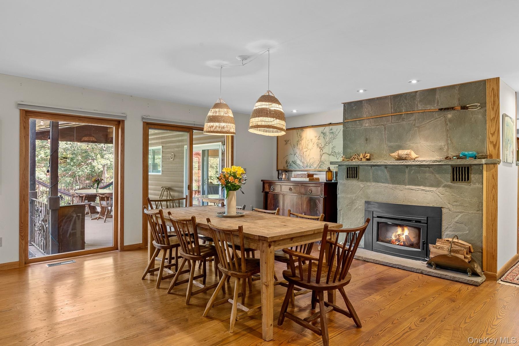 - Dining area featuring wood finished floors, a fireplace, and recessed lighting