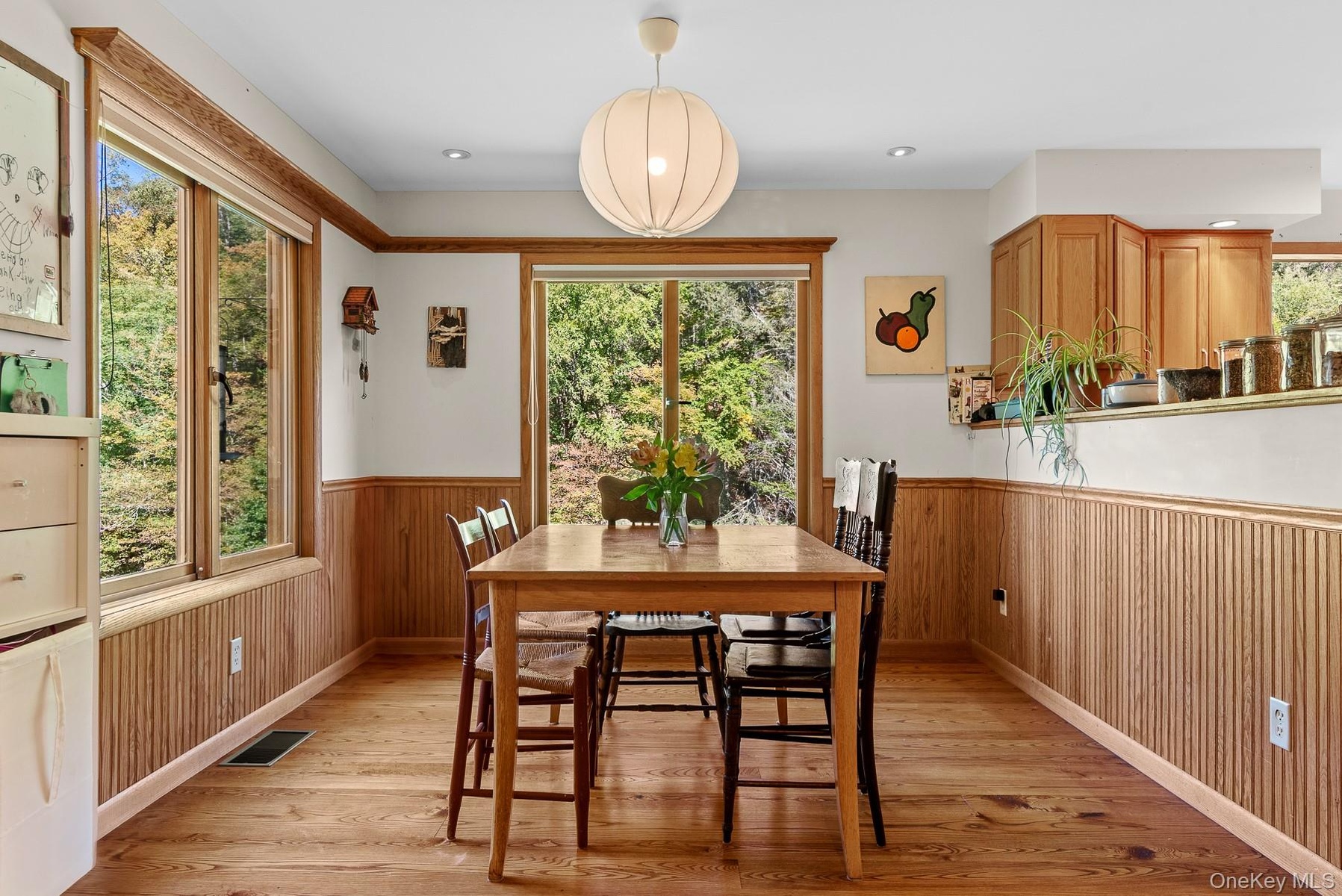 - Dining area featuring light wood finished floors, wainscoting, and wooden walls