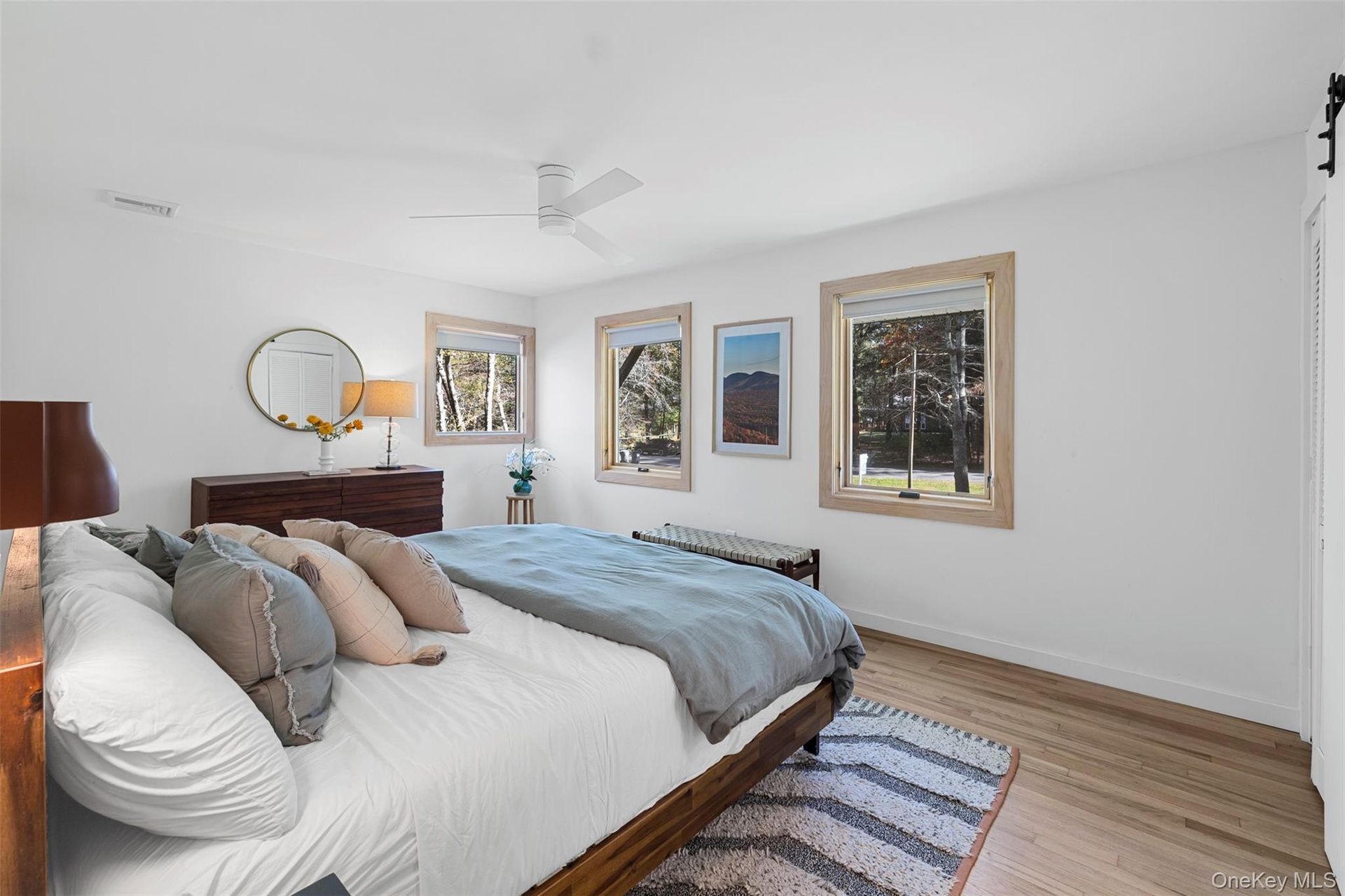 - Bedroom with a barn door, light wood-style flooring, multiple windows, and a ceiling fan