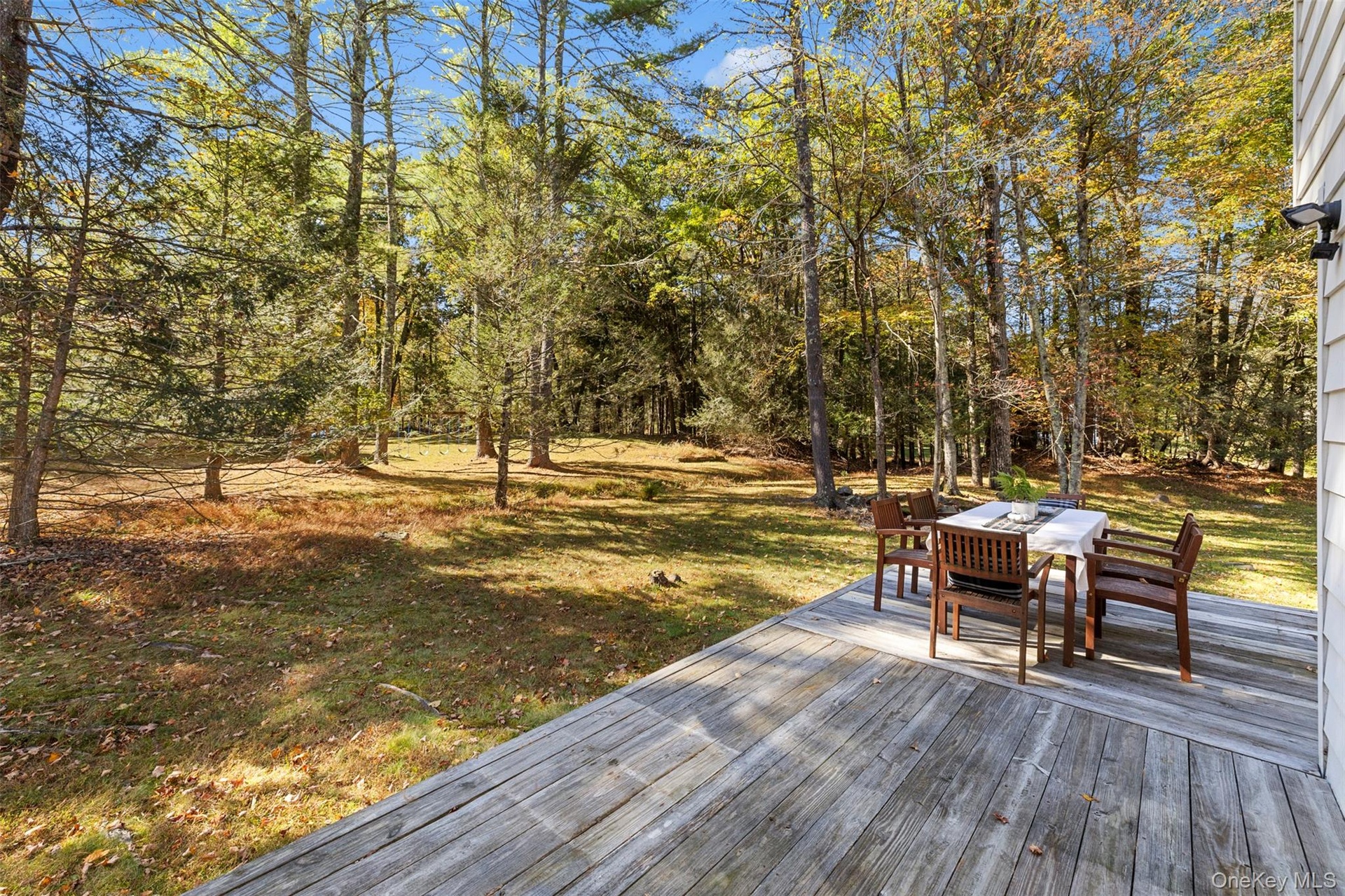 - Deck with a yard, outdoor dining area, and view of wooded area
