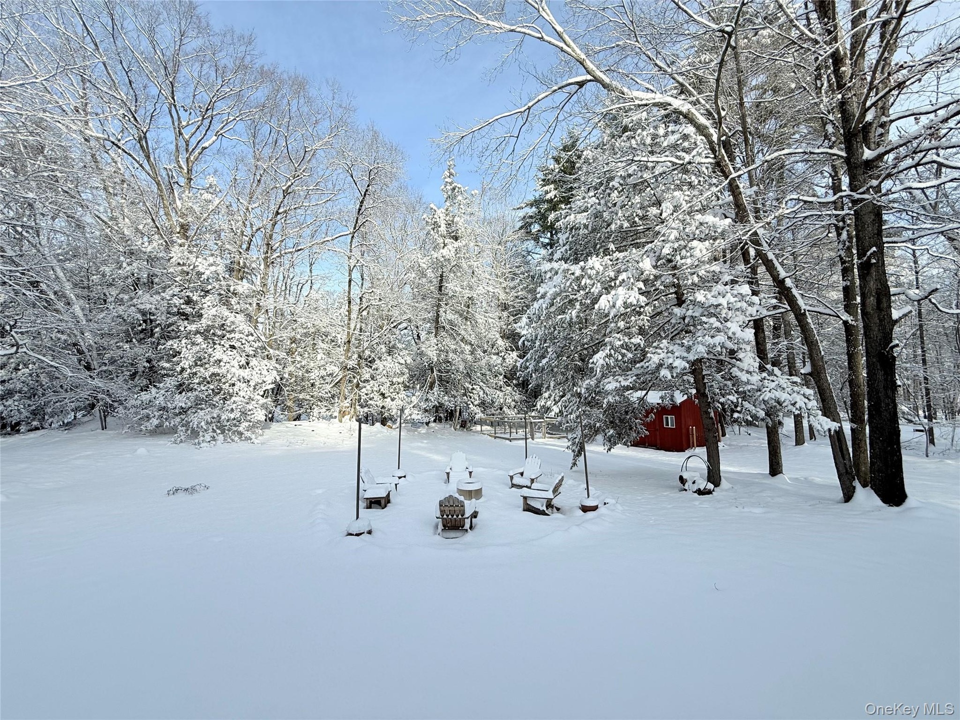 - View of grassy yard featuring a patio area, an outdoor fire pit, a storage unit, and view of scattered trees