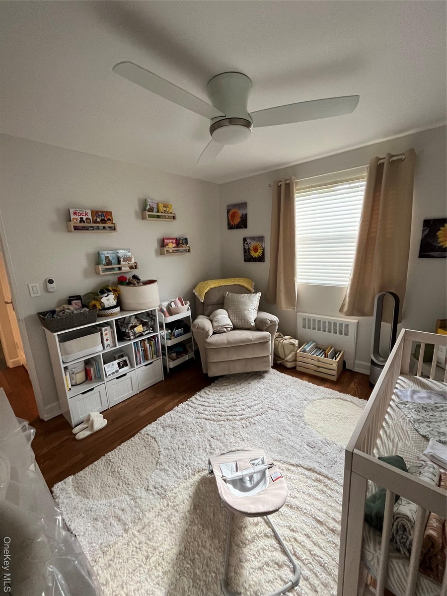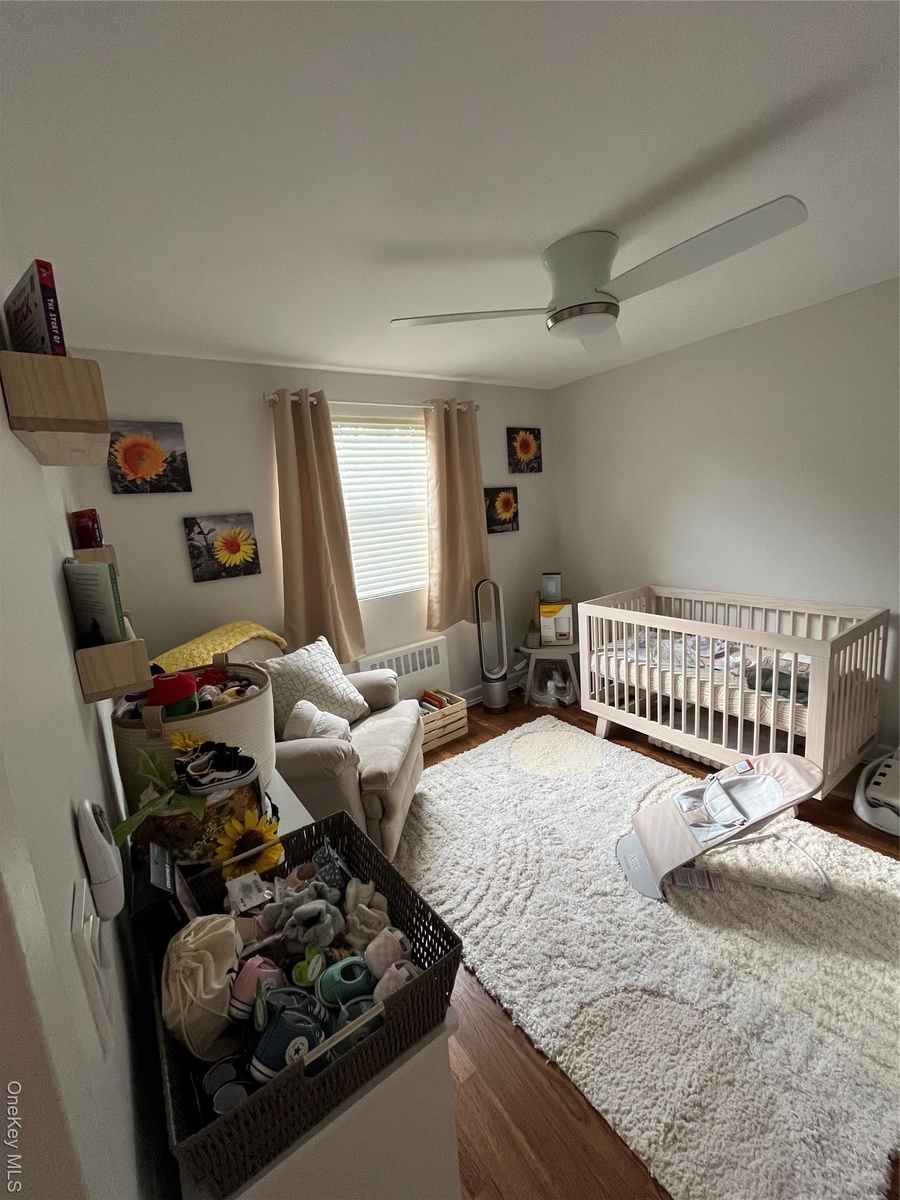 - Bedroom featuring dark wood-style flooring, a crib, ceiling fan, and radiator heating unit
