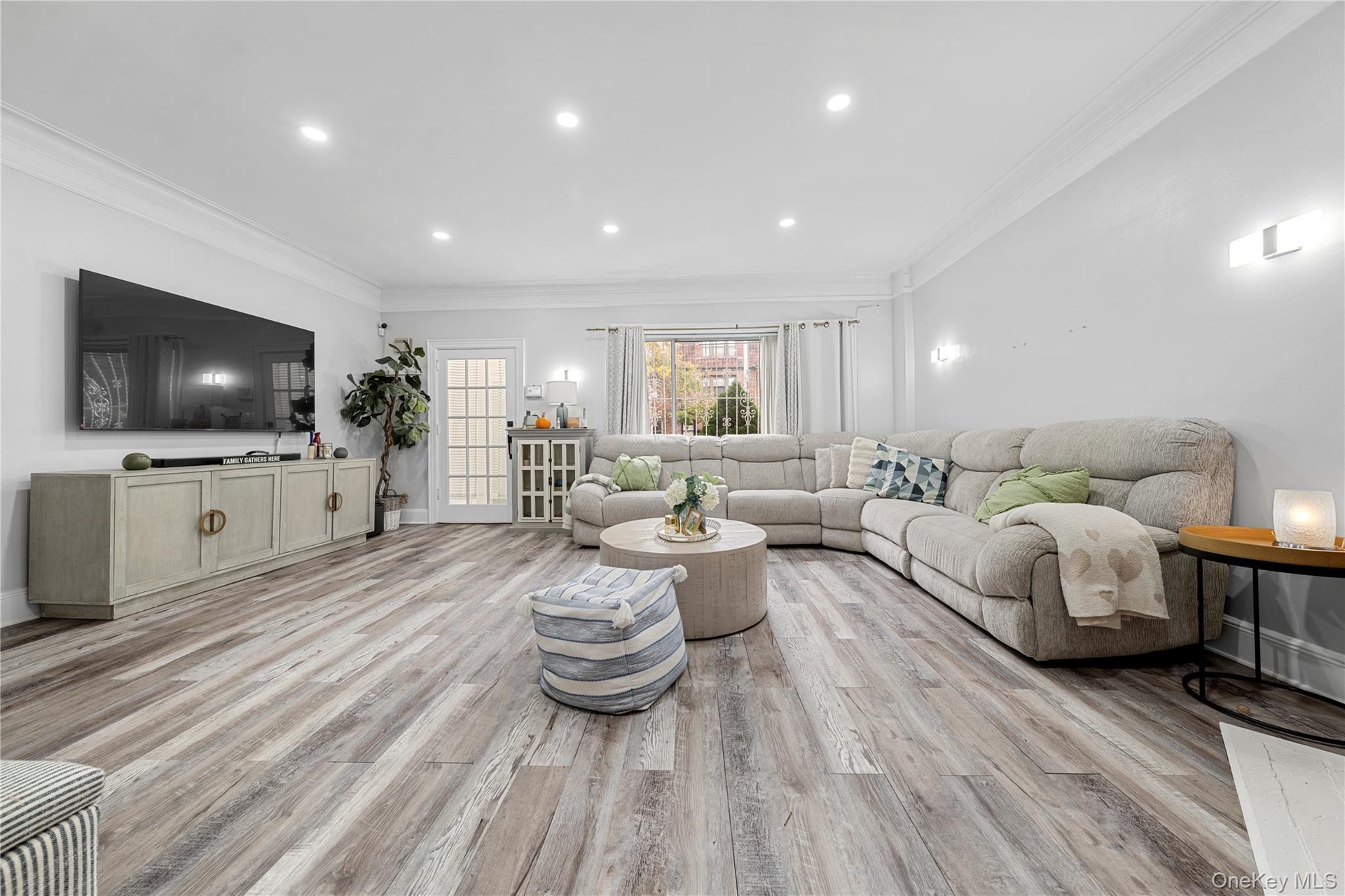 - Living room with ornamental molding, recessed lighting, and light wood-style flooring