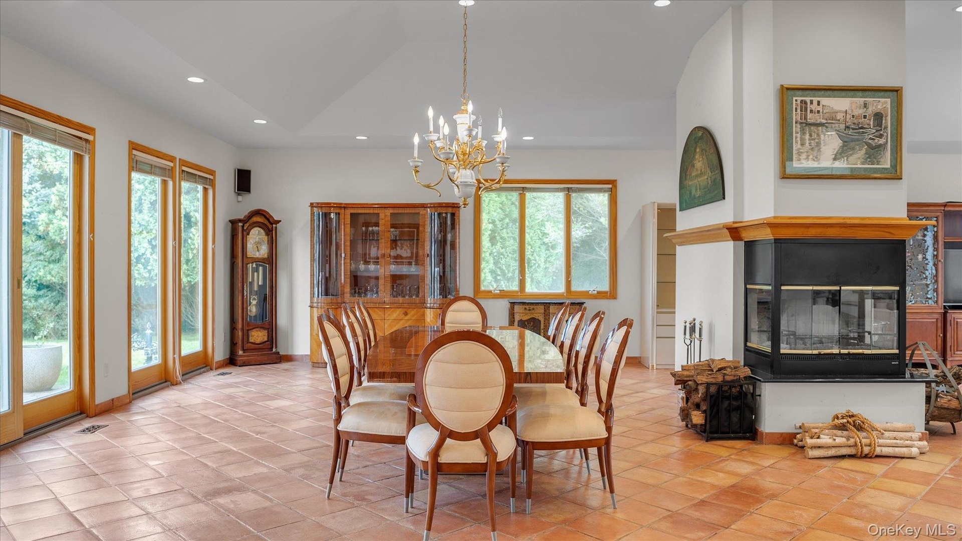 - Tiled dining space featuring recessed lighting, a chandelier, and vaulted ceiling