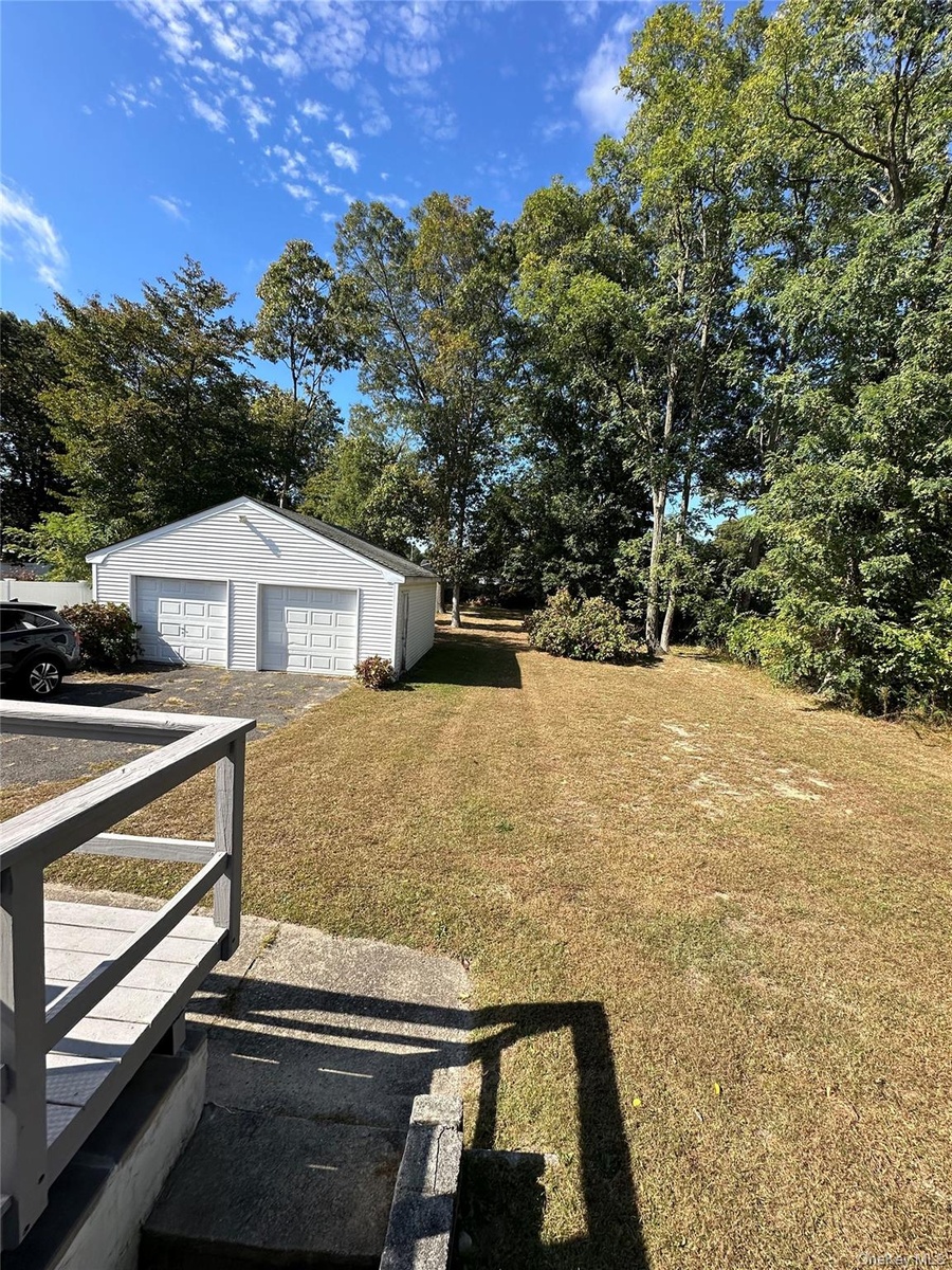 - View of green lawn featuring an outdoor structure, a garage, and view of wooded area