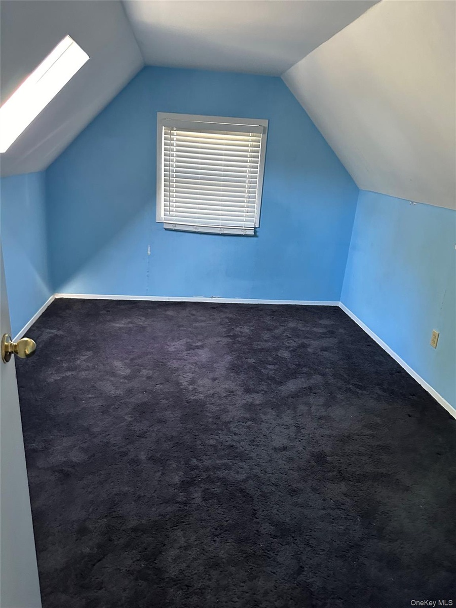 - Bonus room featuring vaulted ceiling, dark carpet, and a skylight