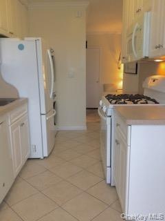 - Kitchen with white appliances, white cabinetry, light countertops, light tile patterned flooring, and ornamental molding