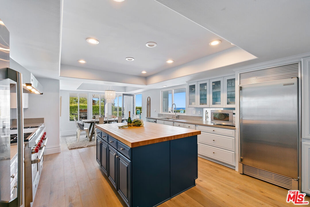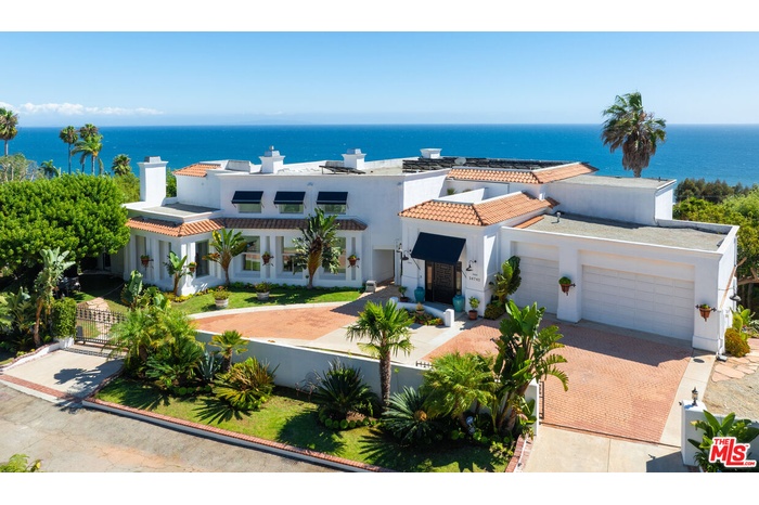 Stately Ocean-View Villa in prime mid-Malibu location with breathtaking Queen's Necklace Views - perched 300ft. above the ocean, moments to the sand. Offering over 6,400 sq. ft. of refined coastal living with sensational ocean, whitewater, and coastline views from nearly every room Designed with sophistication and taste, the home combines grand scale and timeless elegance with a warm, inviting ambiance. A gated entry leads to a wide circular drive and generous parking. Inside, abundant natural light floods open, airy spaces with soaring ceilings, expansive glass walls, and seamless indoor-outdoor flow. The gourmet kitchen features a grand center island, Wolf professional range, double ovens, and opens to both formal and casual dining areas. The living spaces are ideal for entertaining or intimate gatherings, all capturing breathtaking ocean vistas. The spacious primary suite enjoys its own private level with a five star spa-inspired Carrera marble bathroom including double shower, ocean view steam room with full sauna and soaking tub, enormous walk-in closet, wet bar, fridge, fireplace and a private terrace overlooking the sea. A separate wing offers ample accommodations for family and guests, each en-suite with ocean views. Designer-perfect "beach chic" interiors flow throughout the home. Outdoors, the sparkling pool, spa, and expansive decks create a serene retreat for lounging or entertaining against a dramatic ocean backdrop. Situated on a quiet cul-de-sac just minutes to Malibu's best beaches, shopping, and dining. A truly exceptional residence offering the ultimate in coastal sophistication.