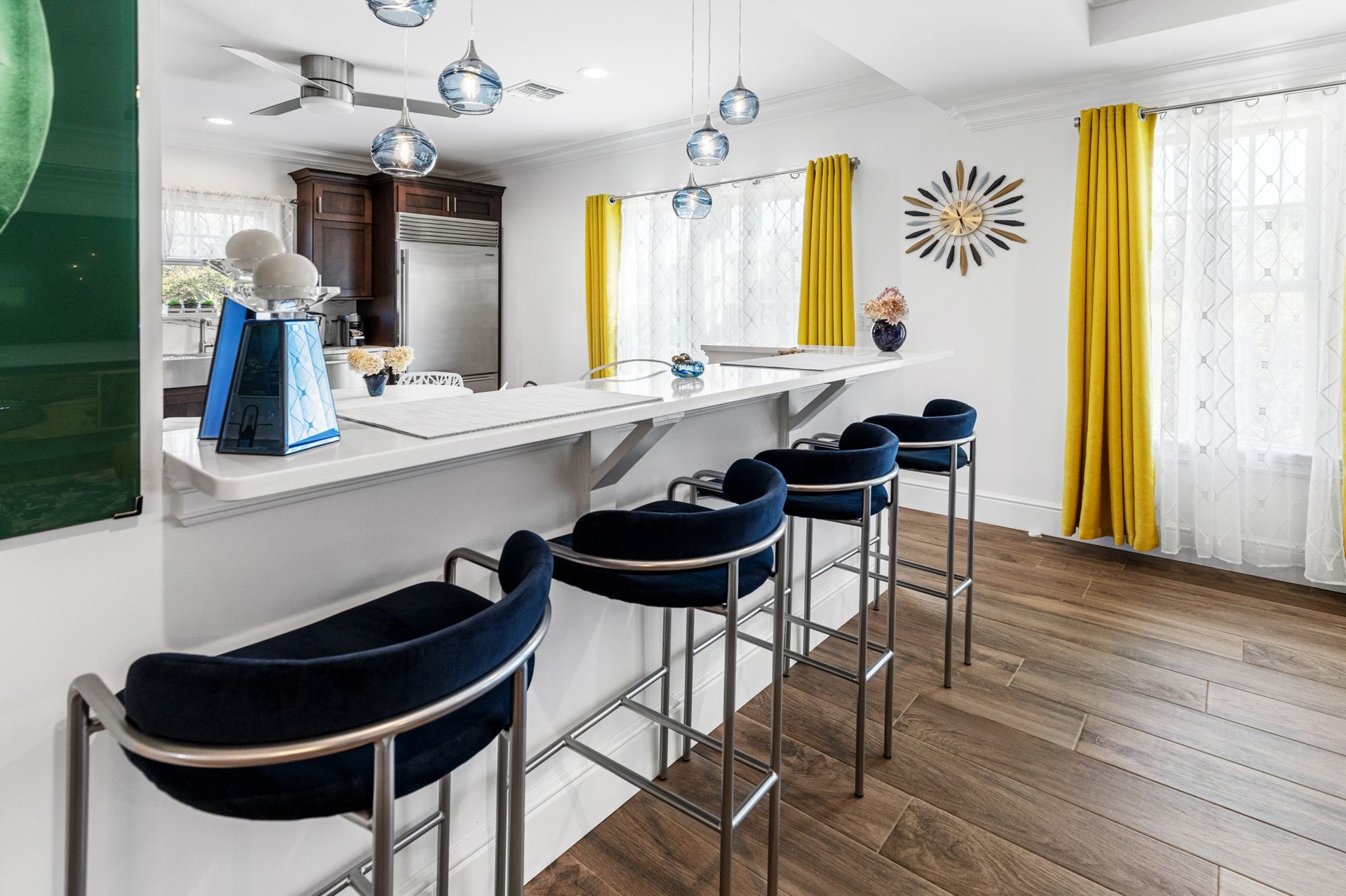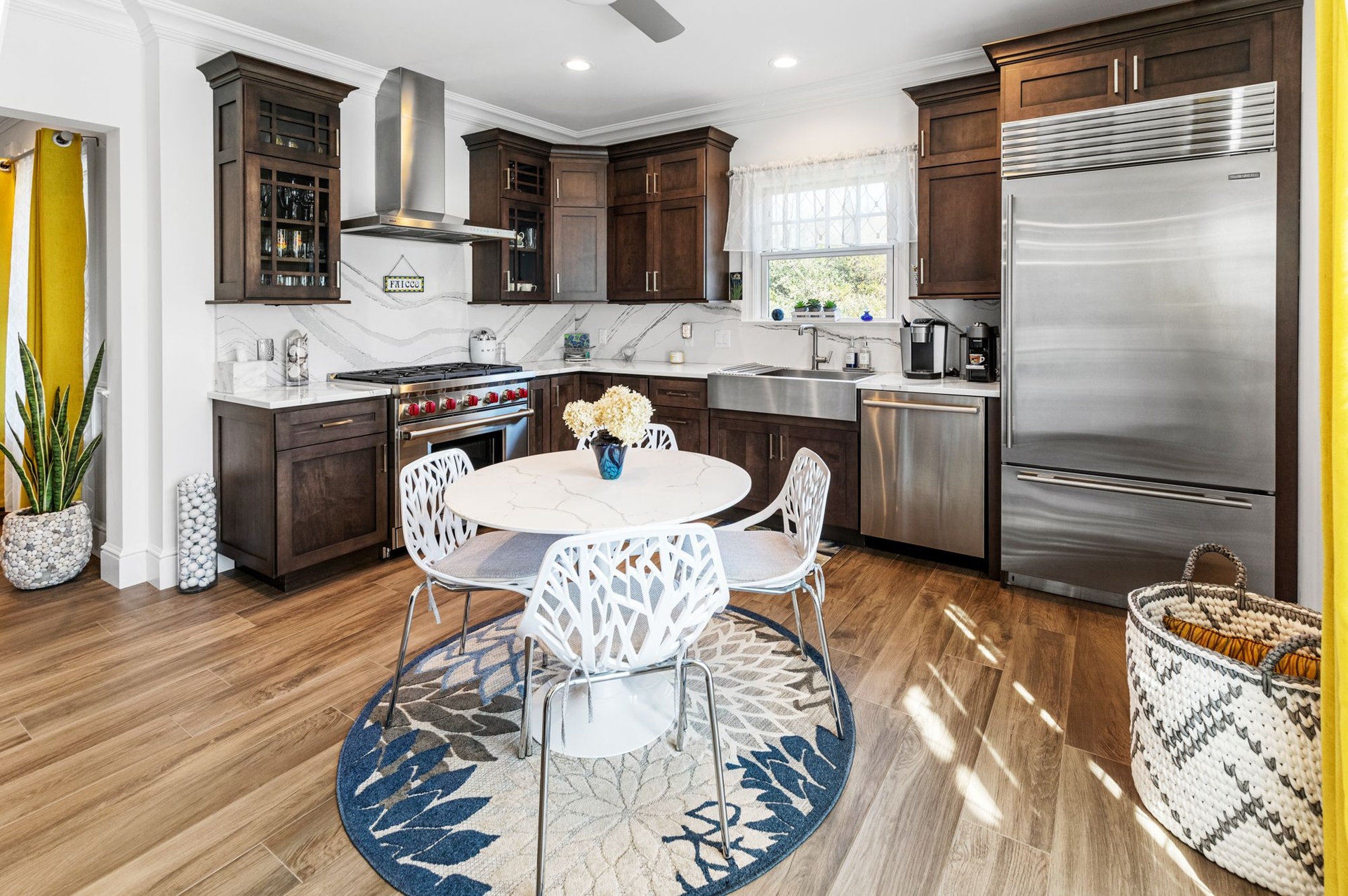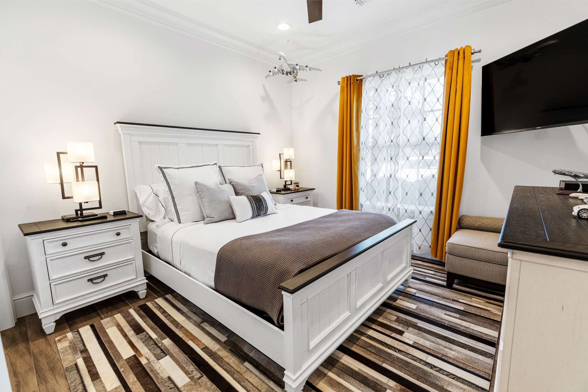 The chef’s kitchen features everything you need: Quartz countertops, Wolf stainless gas range, Sub-Zero refrigerator, Bosch dishwasher, Wolf microwave, Whirlpool washer and dryer and a breakfast bar—ideal for quick pre-round meals or post-golf cocktails.