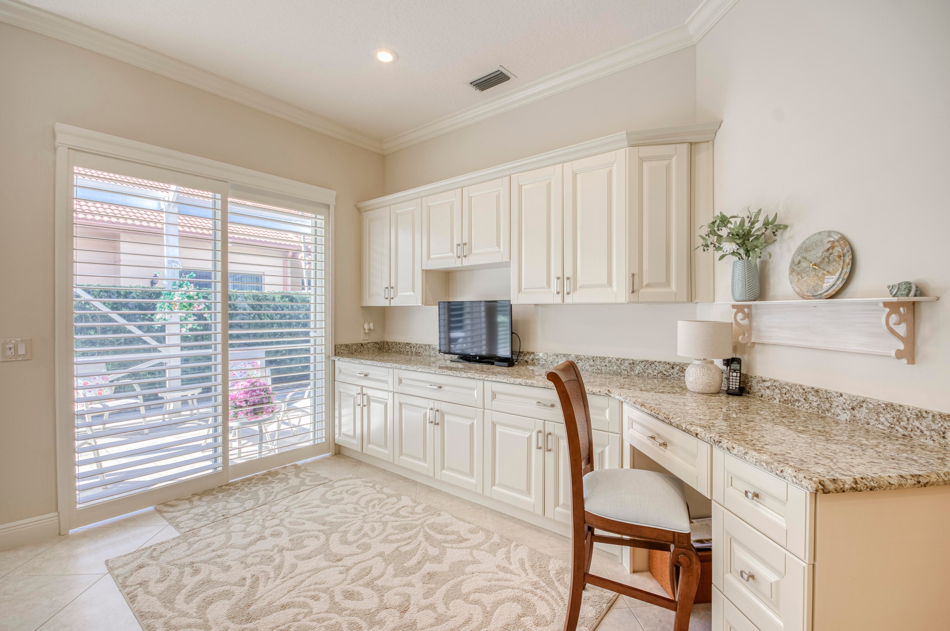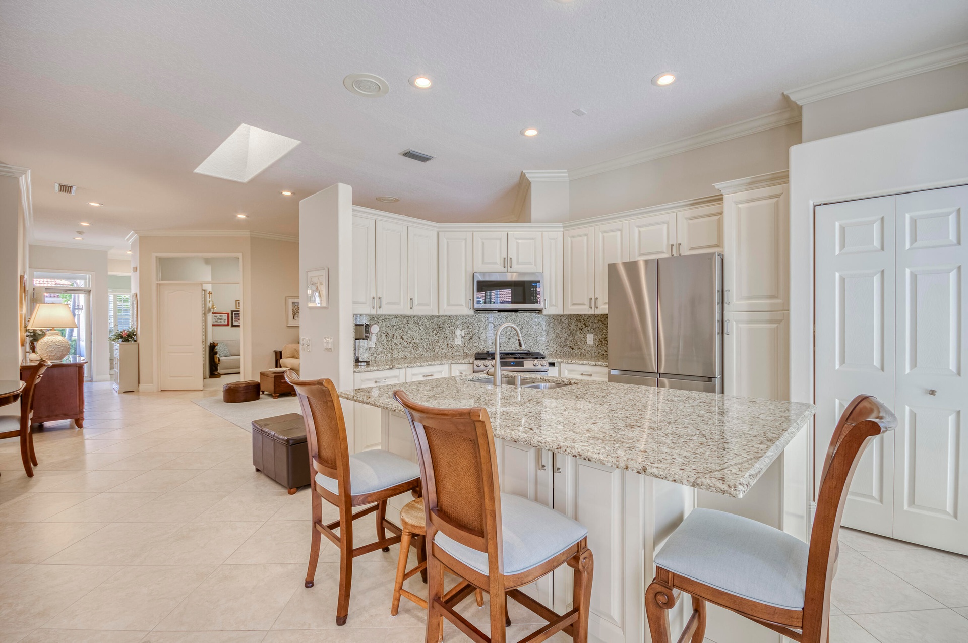This bright and airy one-story CBS townhouse offers 3 bedrooms and 2 bathrooms within 1,620 sq ft of living space in the desirable Monterey Pointe subdivision of PGA National, Palm Beach Gardens. A soft neutral palette and light stone-look tile flow throughout the home, creating a welcoming and seamless ambiance. The spacious living room provides ample seating and entertainment space, enhanced by three plantation-shuttered windows and recessed lighting. Adjacent, the cozy dining room is bathed in natural light from a large skylight, ideal for intimate dinners or gatherings. The kitchen features ivory wood cabinetry with coordinating granite countertops and backsplash, a stainless-steel appliance package including a gas range, and an island snack bar with additional seating.