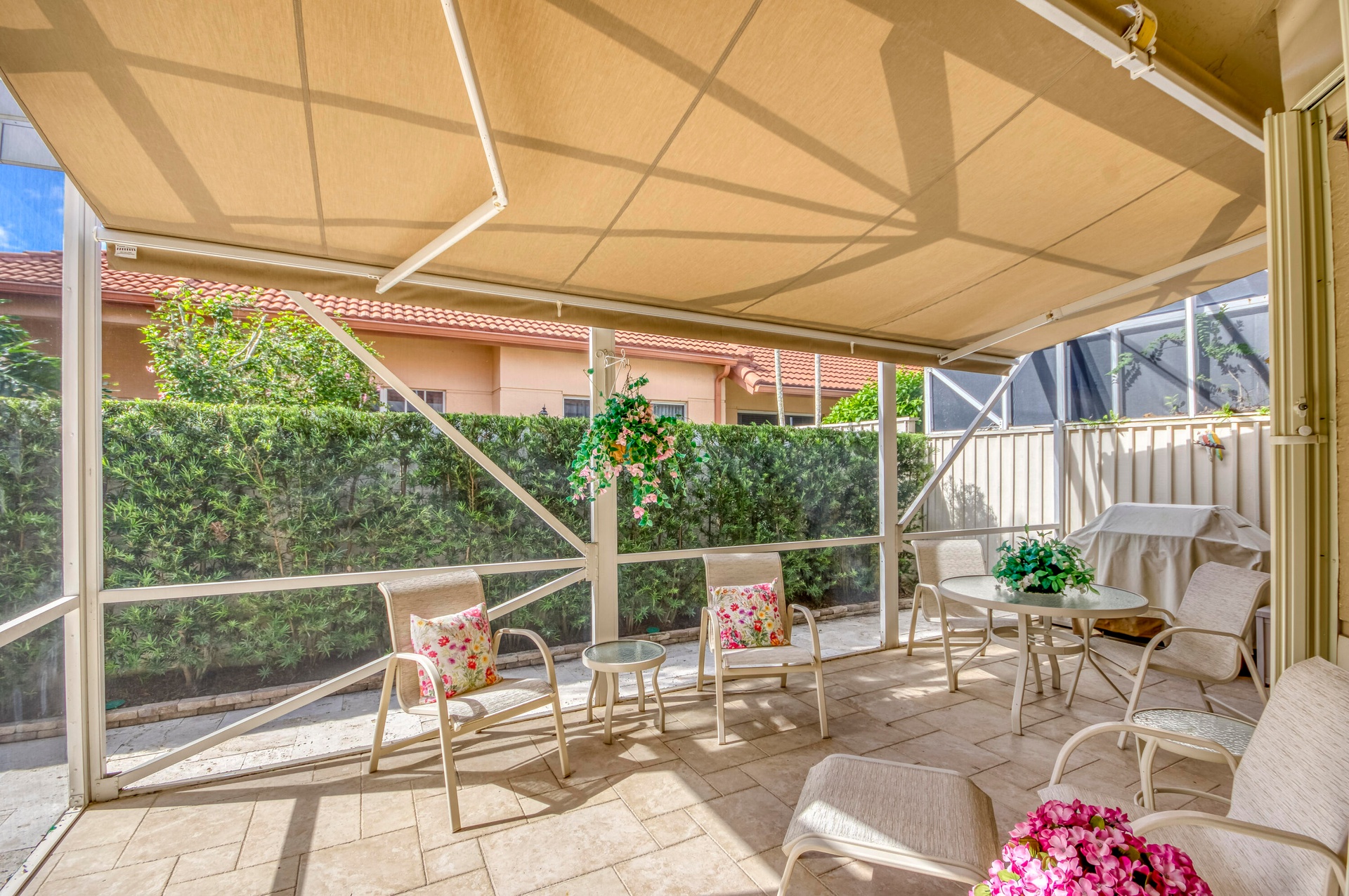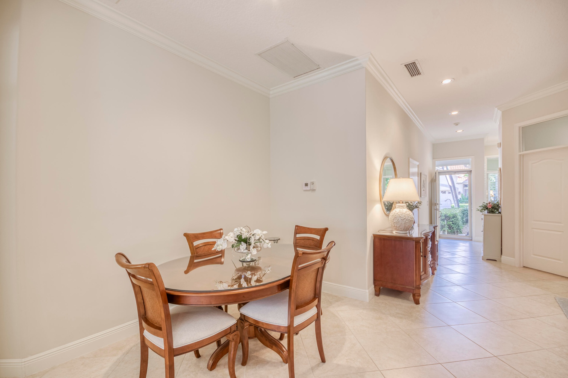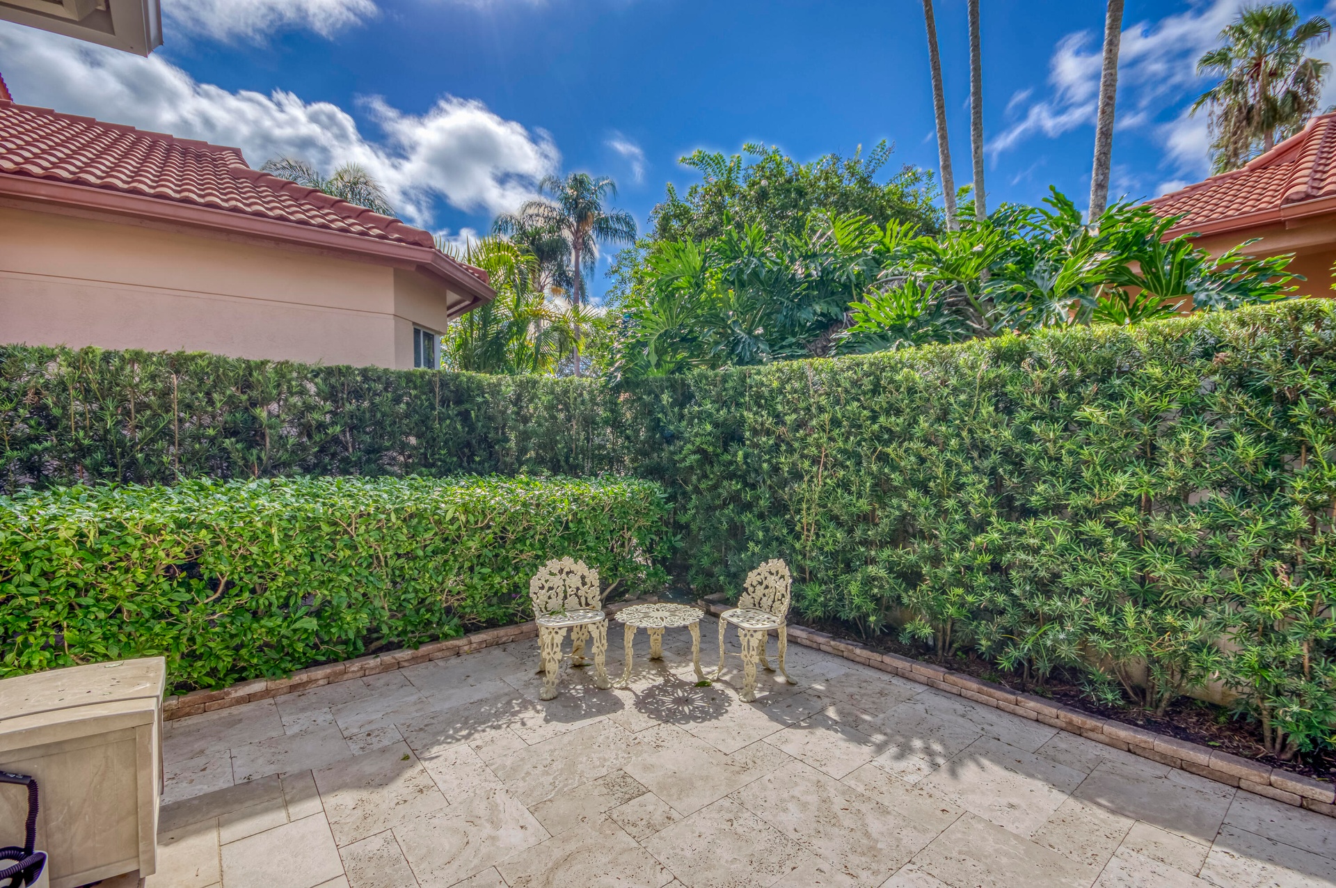 DescriptionThis bright and airy one-story CBS townhouse offers 3 bedrooms and 2 bathrooms within 1,620 sq ft of living space in the desirable Monterey Pointe subdivision of PGA National, Palm Beach Gardens. A soft neutral palette and light stone-look tile flow throughout the home, creating a welcoming and seamless ambiance. The spacious living room provides ample seating and entertainment space, enhanced by three plantation-shuttered windows and recessed lighting. Adjacent, the cozy dining room is bathed in natural light from a large skylight, ideal for intimate dinners or gatherings. The kitchen features ivory wood cabinetry with coordinating granite countertops and backsplash, a stainless-steel appliance package including a gas range, and an island snack bar with additional seating.