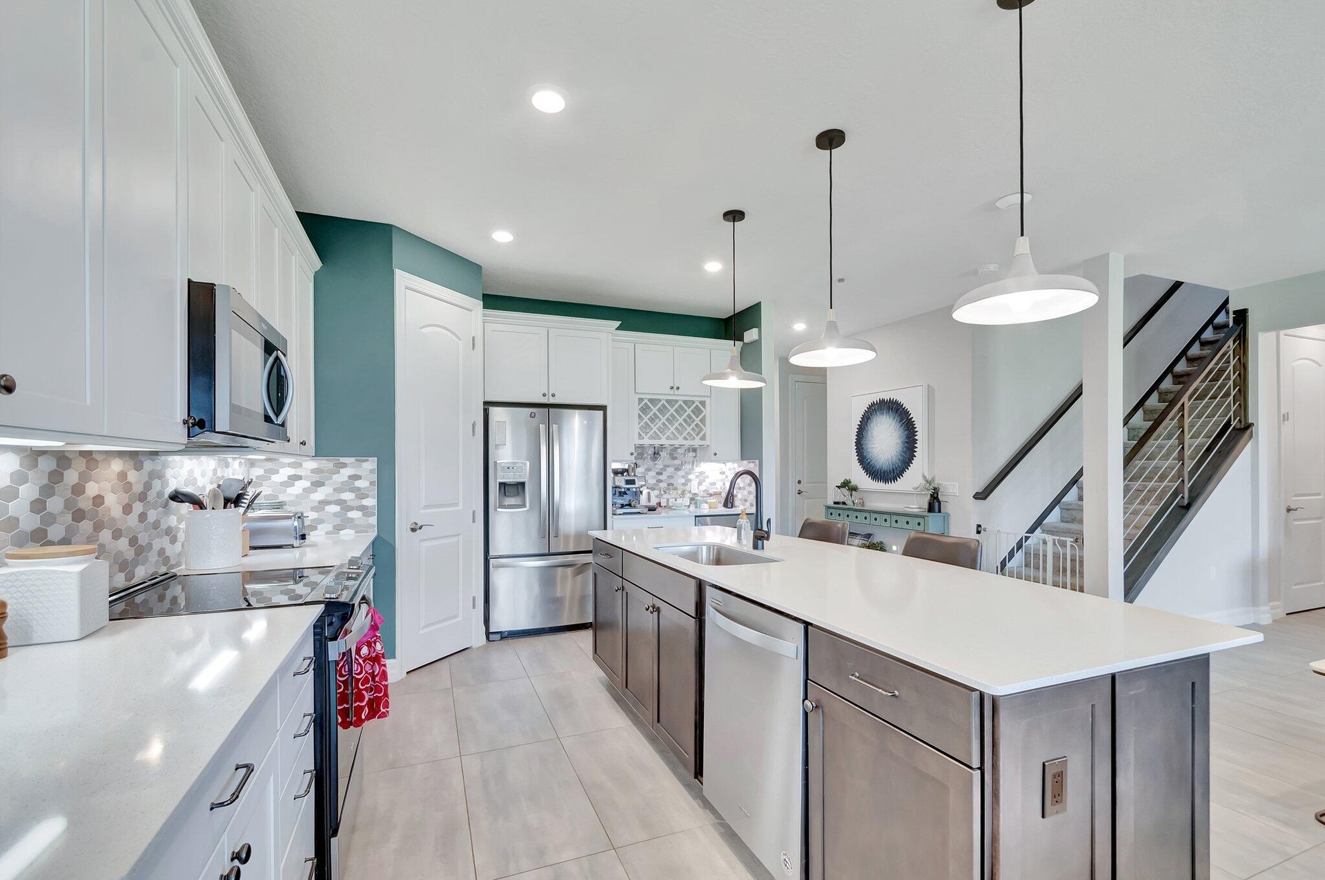 Formerly the model home for the Citrus Grove model! Bought directly from the developer, this upgraded model home offers 5 bedrooms, 3 bathrooms, a spacious upstairs den, and countless high end features. With thousands in builder upgrades including custom feature walls, built-ins, a wine fridge, shiplap ceilings, stair railings, and designer lighting with upgraded chandelier and pendant fixtures. The oversized kitchen is a centerpiece, boasting quartz countertops, a stylish backsplash, and a massive island. On the main floor, you'll find two bedrooms and a full laundry room, with a 2 car garage. Upstairs includes three more bedrooms and a generously sized den, ideal as a home office or playroom. Step outside to a screened-in patio and take in the lake view from your fenced yard.