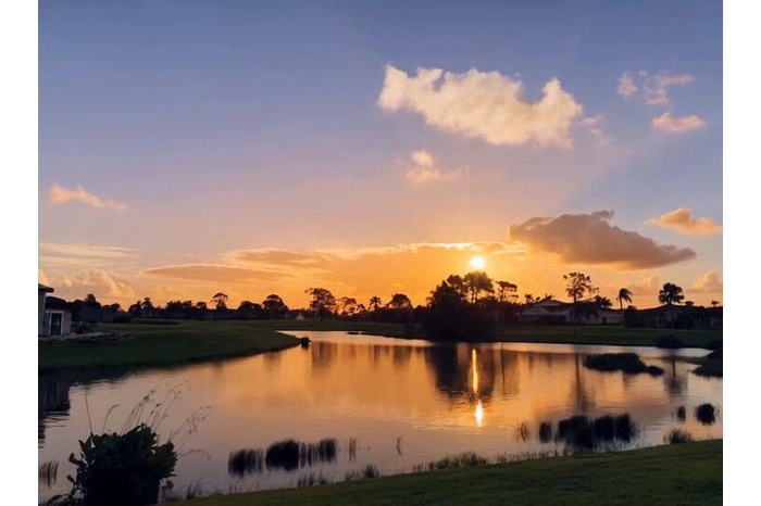 The sunrise reflects on the waters of this long view lakefront building site, with tee to green views of the Palmer 5th golf hole in the distance.