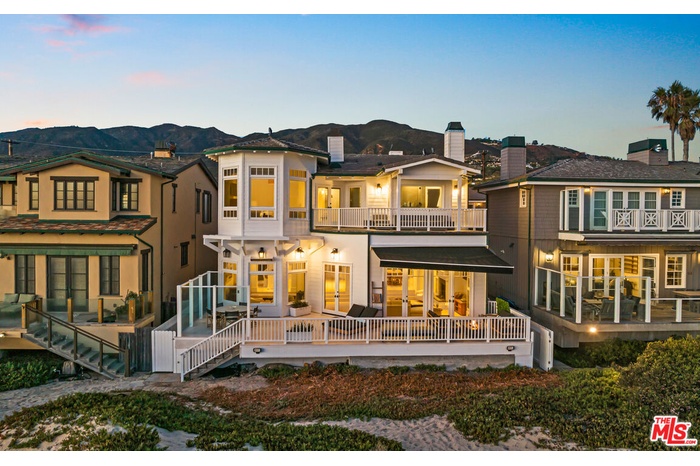 This Cape Cod-style home on Trancas Beach blends Malibu's coastline with effortless, luxurious living. Set on a wide, flat stretch of sandy shoreline, this residence offers expansive ocean views and ample space for indoor-outdoor living and entertaining. A gated entry opens to a charming breezeway, leading to a private courtyard featuring a flagstone fireplace, lounge seating, and a covered Jacuzzi with a waterfall.Freshly updated inside and out, the property includes a two-bedroom, one-bath guesthouse with its own kitchen, gym area, living room with fireplace, and abundant natural light. Accessible either from within the main house or through a separate courtyard entrance, the guesthouse offers privacy and flexibility for visitors or extended stays.The main house showcases light-toned wood floors and ocean views from the moment you step inside. Off the entry, a bonus/media room is equipped with a pool table, Stewart projection screen, en-suite bathroom, and French doors opening to the courtyard. A powder room and laundry room are also conveniently located off the entry hall.The country-style kitchen is the heart of the home, featuring a cozy fireplace, stone countertops, high-end appliances, and ample cabinet space. The kitchen connects to both the family room, which opens to the courtyard, and the living room, where ocean views take center stage. The living room boasts a fireplace and three sets of French doors that lead to a newly renovated, heated beachfront deck. This outdoor space is perfect for dining, lounging, and entertaining, complete with a Weber barbecue, firepit, and steps down to the sandy beach.An additional bar-lounge area enhances the living room's appeal, while the formal dining room, with its fireplace, flatscreen TV, and ocean views, offers a sophisticated setting for meals. A large double-sided fish tank, visible from both the dining room and hallway, adds a unique touch.The upper floor houses three bedrooms, each with balcony access. The primary suite is a luxurious retreat with vaulted ceilings, a fireplace, a sitting area with stunning ocean views, custom closets, a spa-style bath, and an oceanfront balcony with seating. Both the main house and the guesthouse are air-conditioned for comfort.Additional features include an outdoor shower in the side yard, three garages facing the street, and easy access to Trancas Country Market, a short walk away with its shops and dining options. This oceanfront getaway epitomizes Malibu living, with its perfect blend of style, comfort, and breathtaking views. $95,000 per month during the summer months.