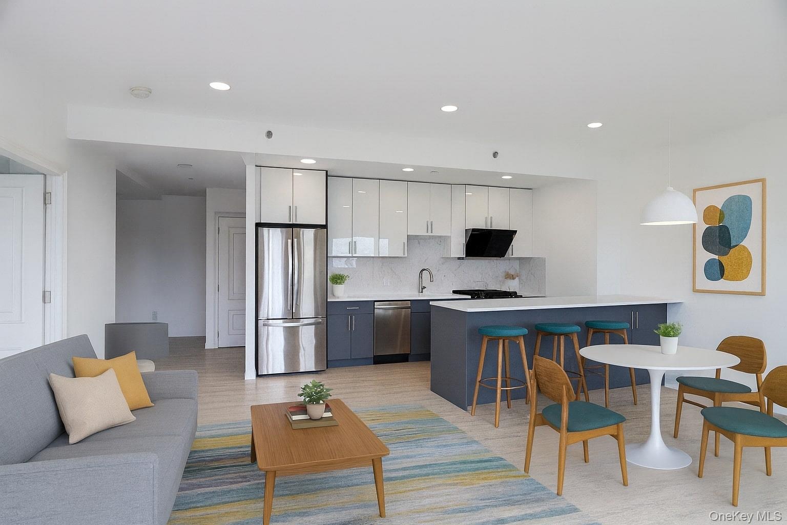 - Kitchen featuring white cabinetry, open floor plan, appliances with stainless steel finishes, light wood-style flooring, and recessed lighting