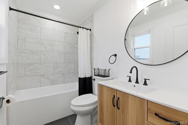 - Full bath featuring vanity, shower / bathtub combination with curtain, and dark tile patterned flooring