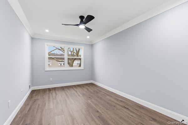 - Empty room with wood finished floors, ceiling fan, recessed lighting, and ornamental molding