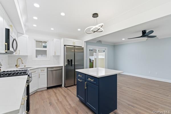 - Kitchen with white cabinets, light wood finished floors, stainless steel appliances, blue cabinets, and decorative backsplash