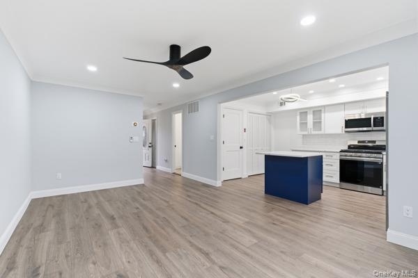 - Kitchen featuring light wood-style floors, appliances with stainless steel finishes, a center island, white cabinetry, and recessed lighting