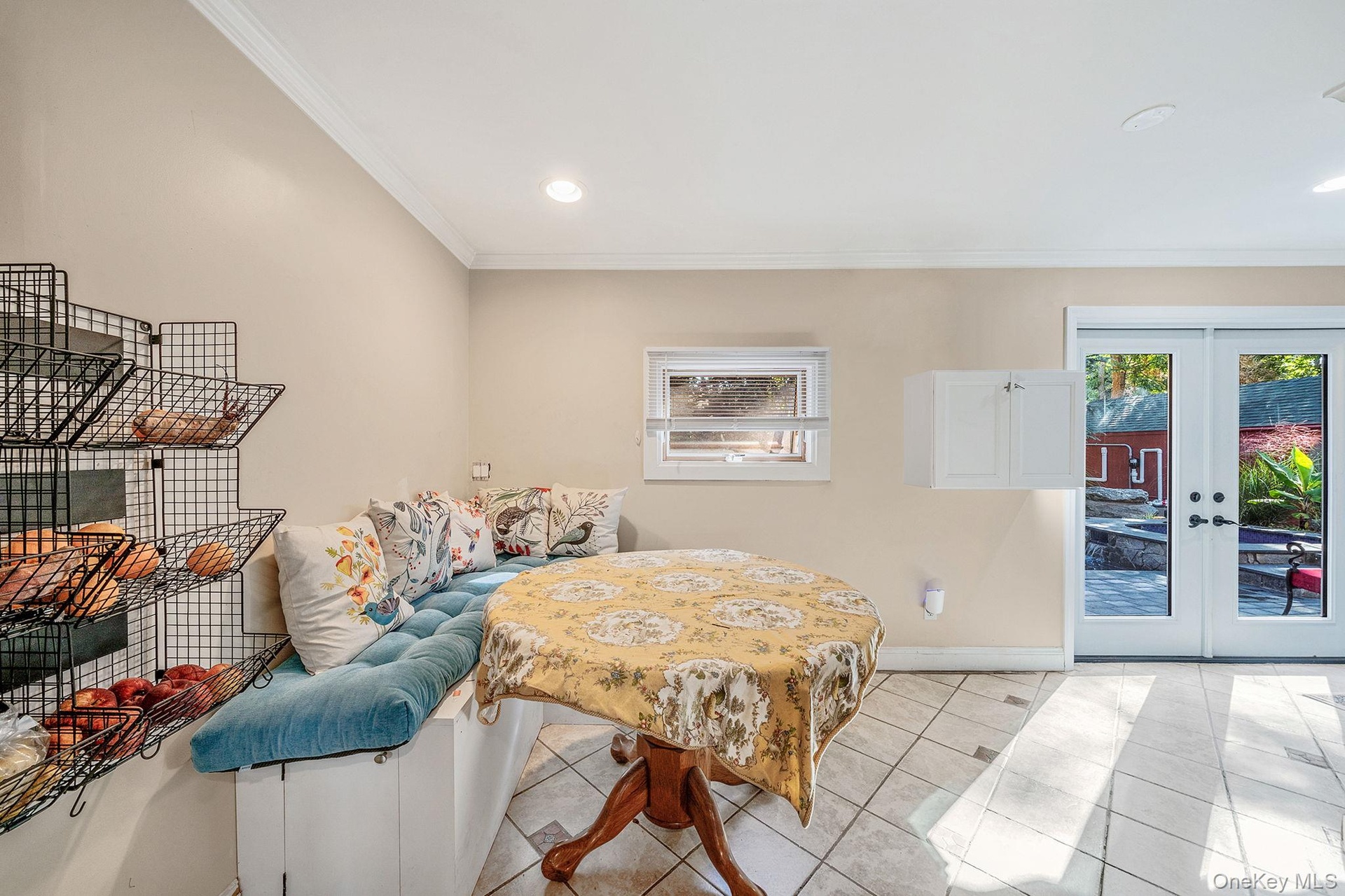 - Tiled dining area with french doors, crown molding, and recessed lighting
