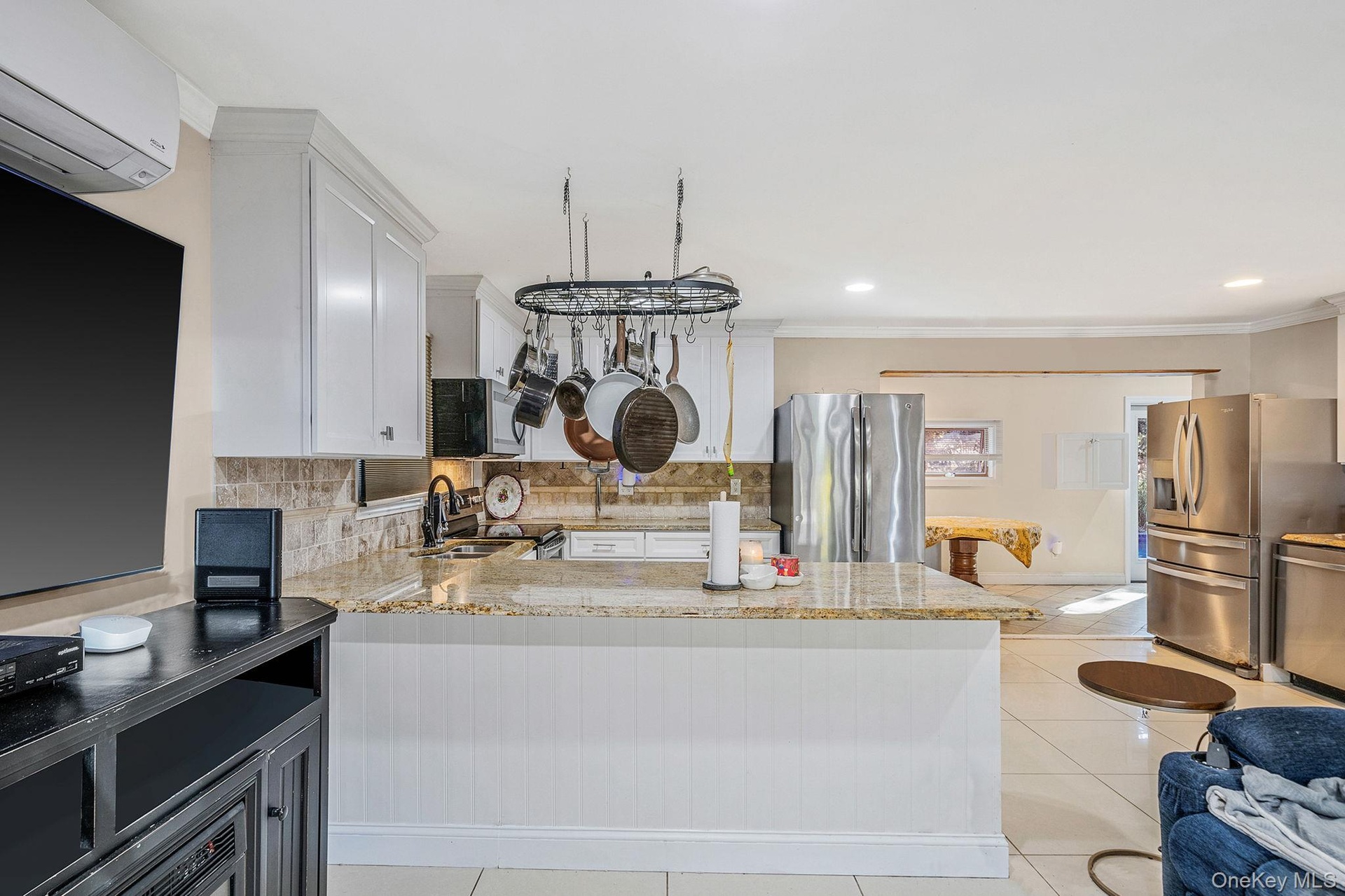 - Kitchen featuring a peninsula, stainless steel appliances, light stone countertops, tasteful backsplash, and crown molding