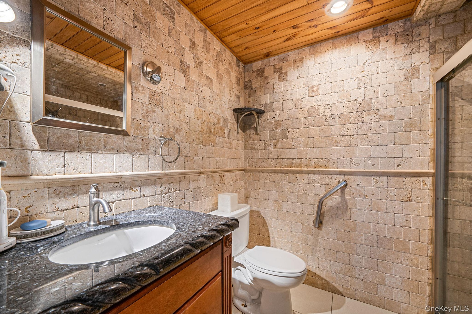 - Full bathroom featuring vanity, tiled shower, wooden ceiling, tile walls, and recessed lighting