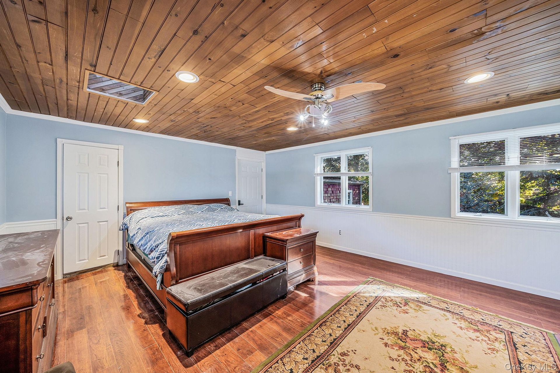 - Bedroom with ornamental molding, wood finished floors, recessed lighting, wooden ceiling, and ceiling fan