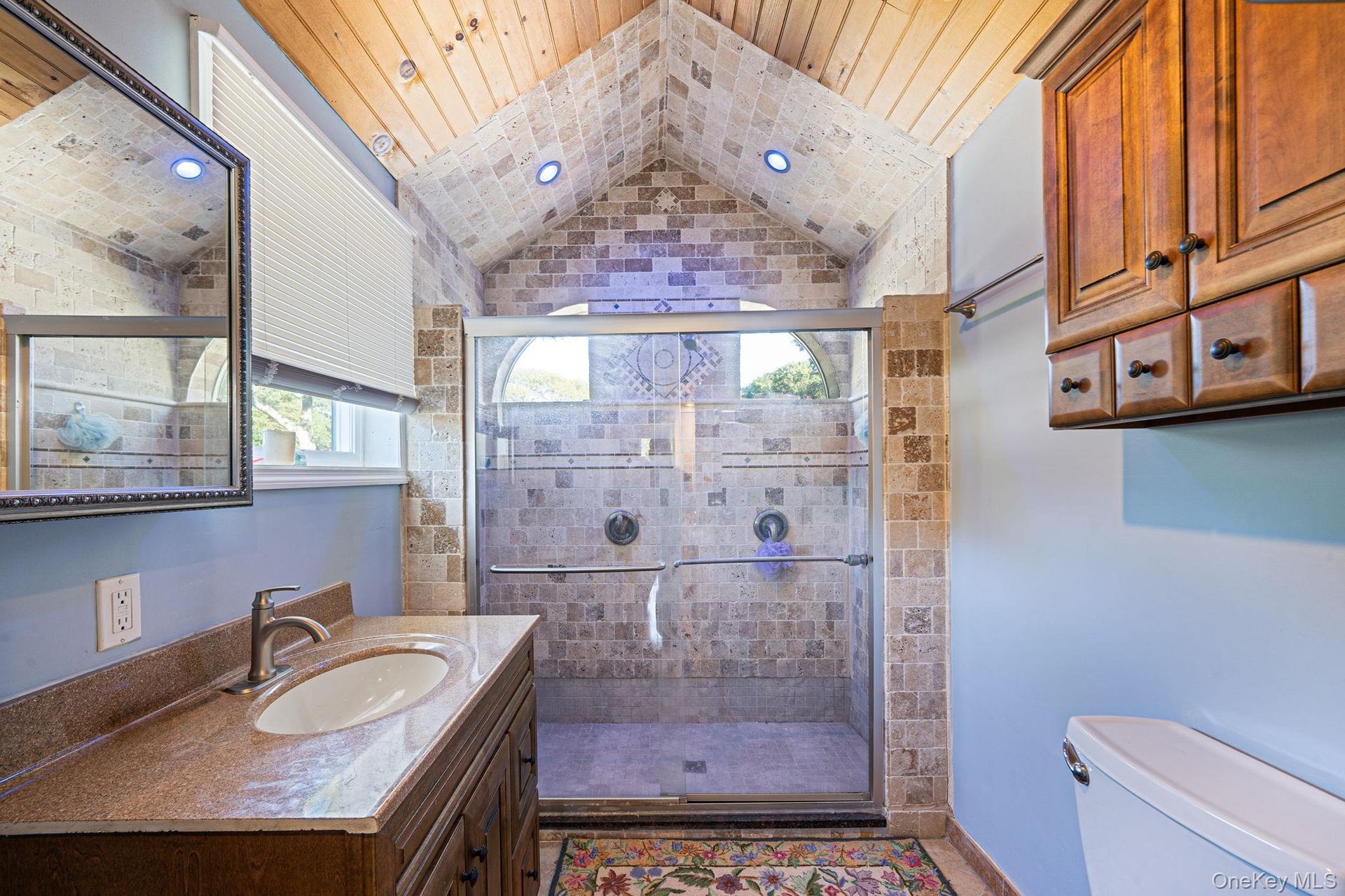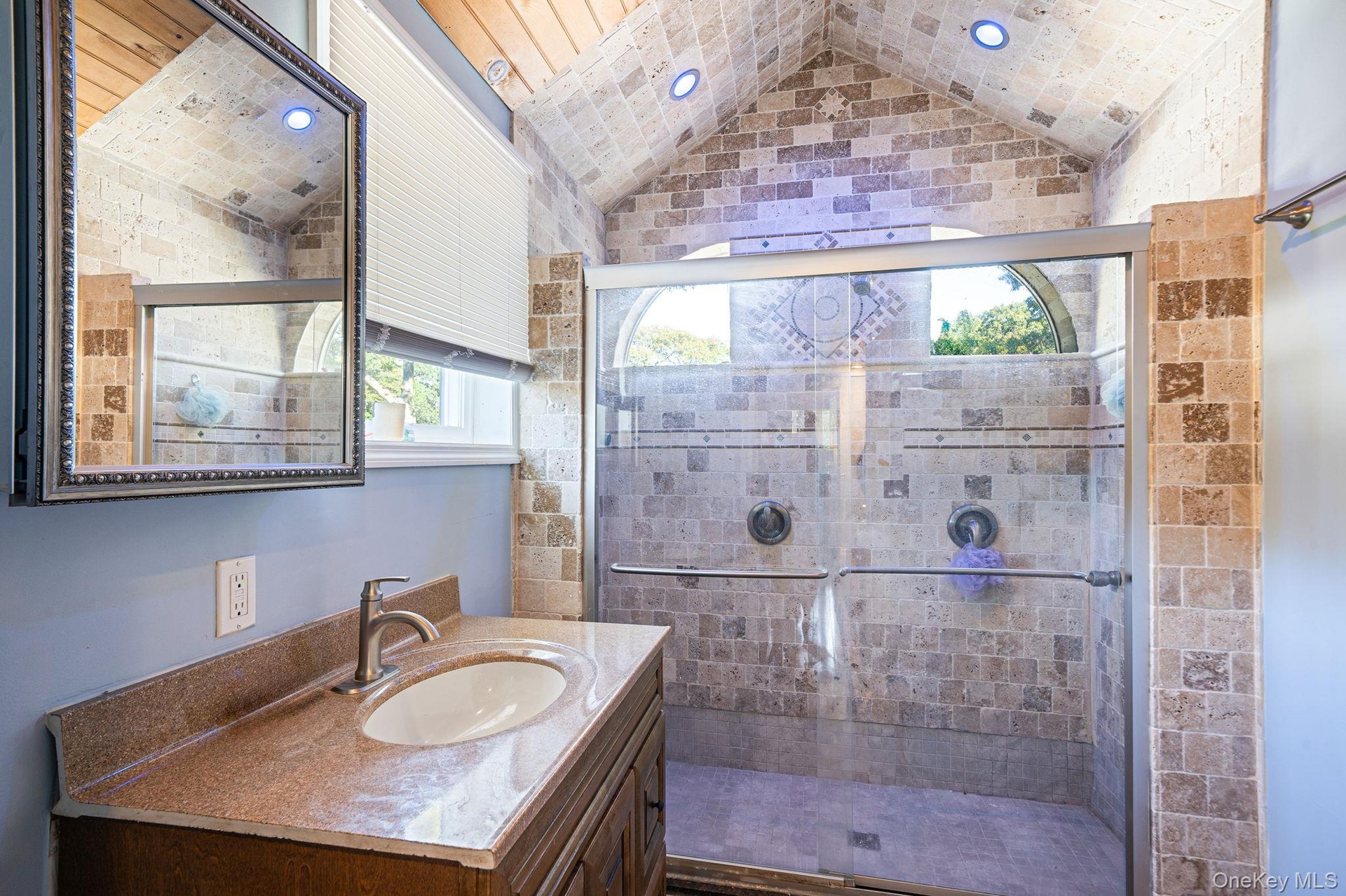- Full bath with vanity, a shower stall, and vaulted ceiling