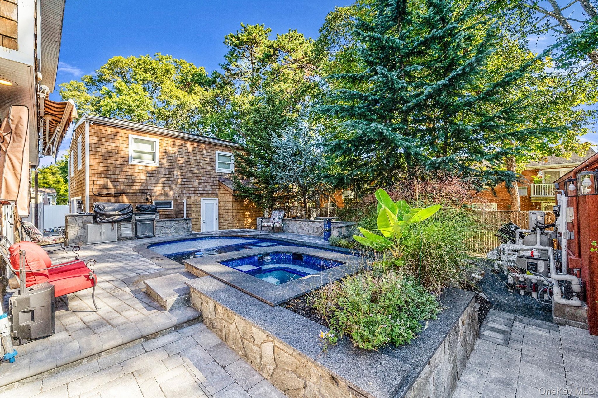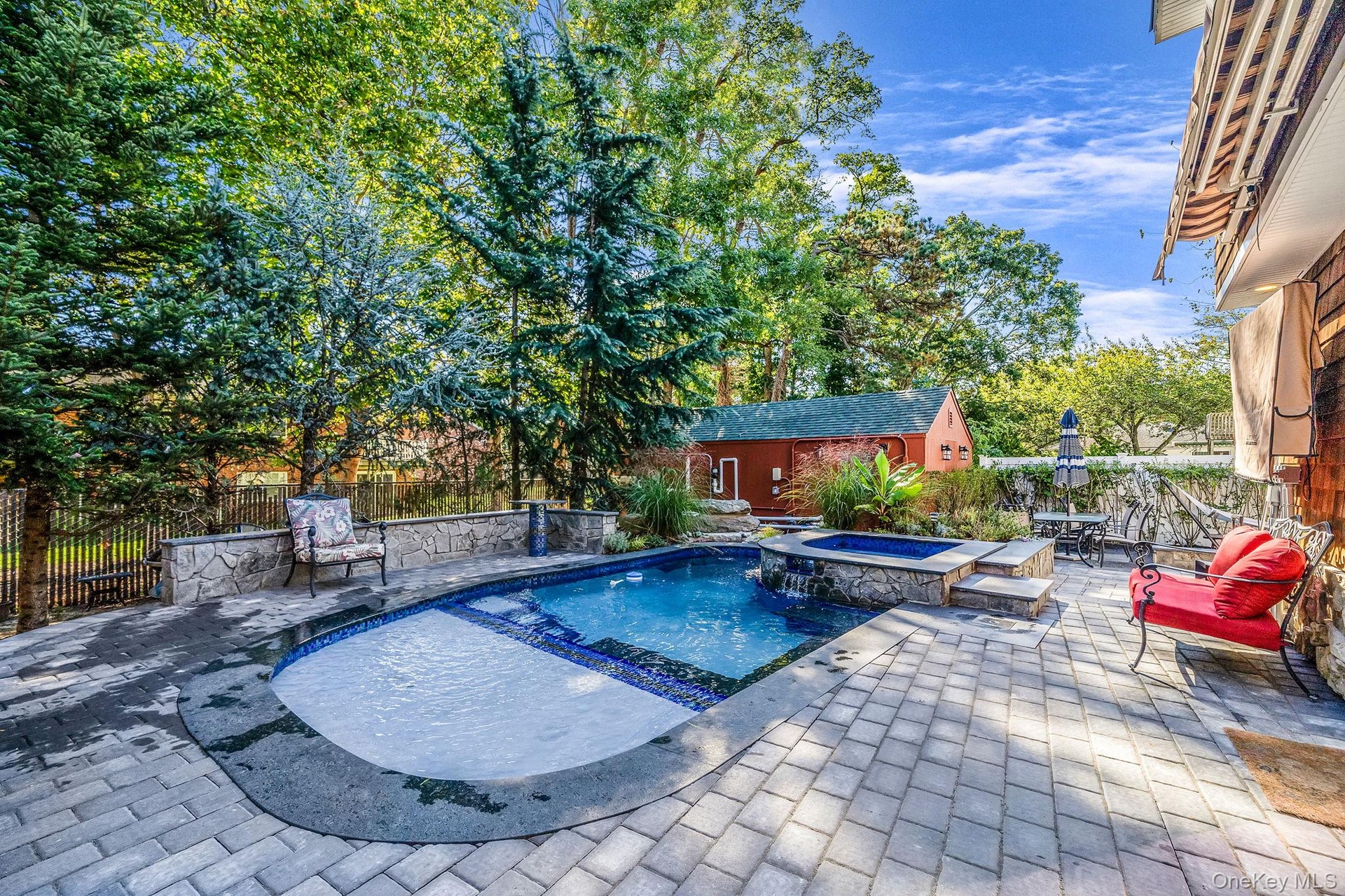 Outdoors, the backyard is a true retreat: a custom gunite pool with overspill spa, waterfall, Baja shelf, floor fountains, and multi-level stone verandas with granite coping and caps—ideal for entertaining or relaxing in privacy. The detached structure mirrors the quality of the main home, with custom glass tile accents and granite finishes—ready for your vision.