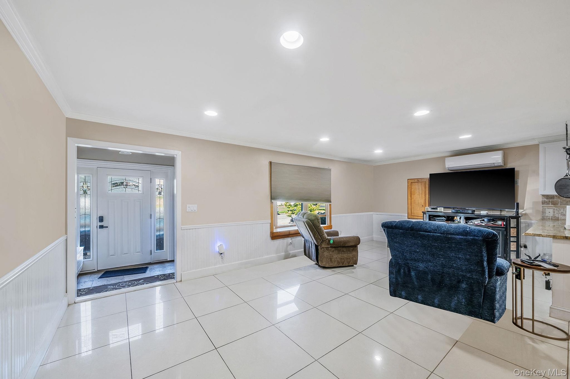 - Living area featuring ornamental molding, recessed lighting, a wainscoted wall, and light tile patterned flooring