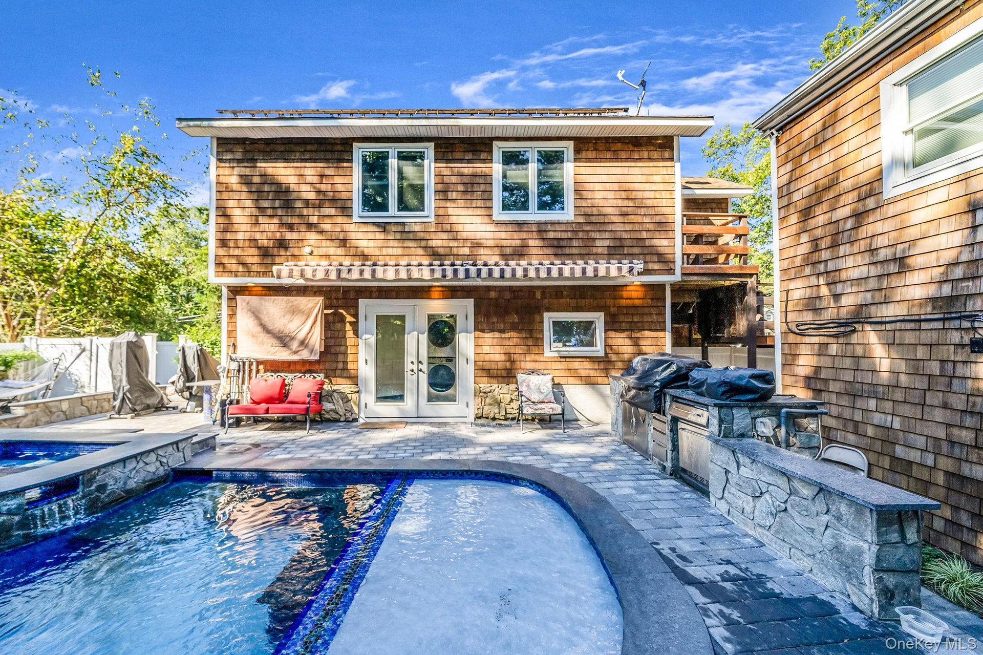 - Rear view of property featuring an outdoor kitchen, french doors, a patio, and a pool with connected hot tub