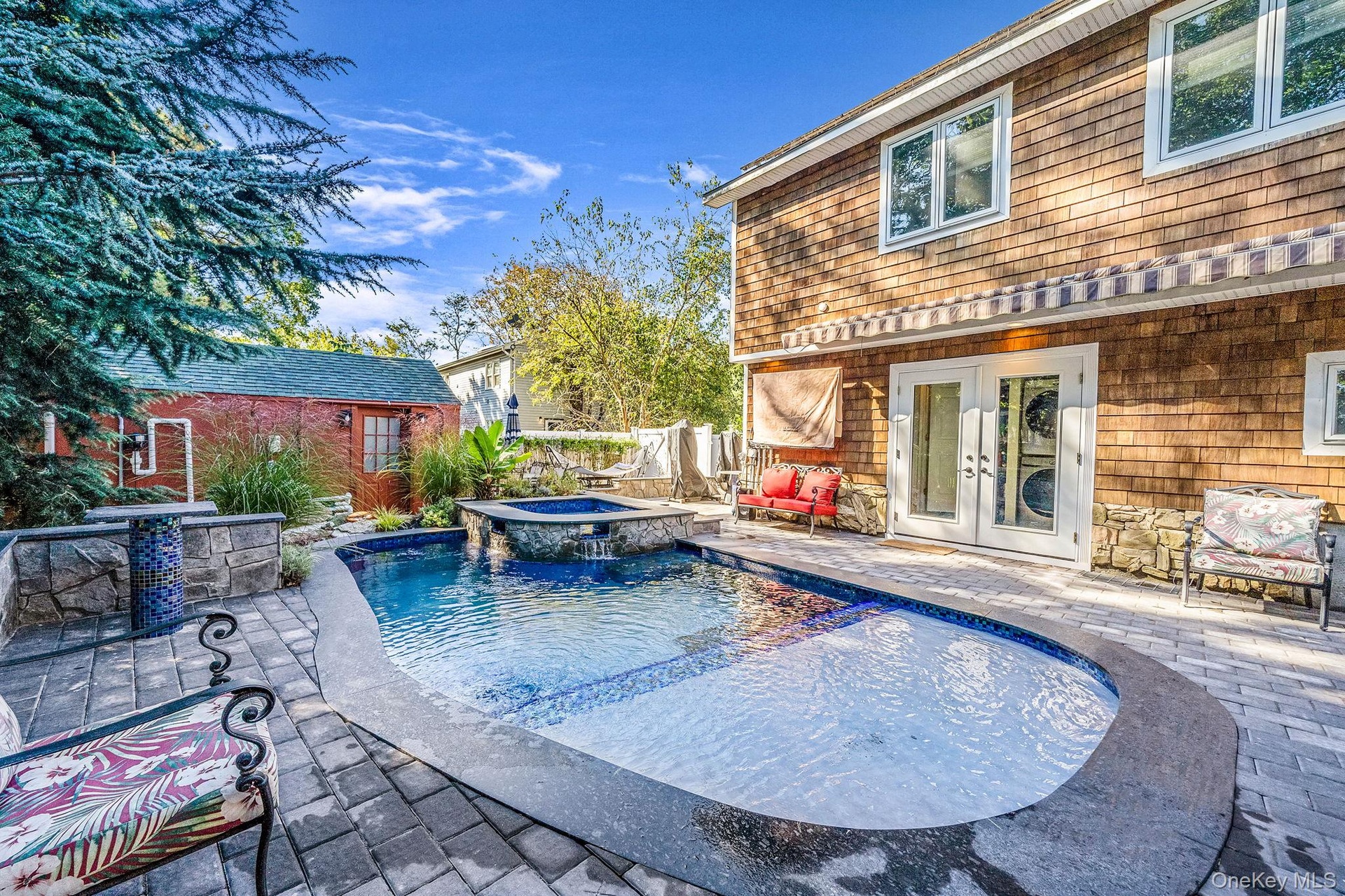 - View of swimming pool with a patio, french doors, an outdoor structure, and a pool with connected hot tub