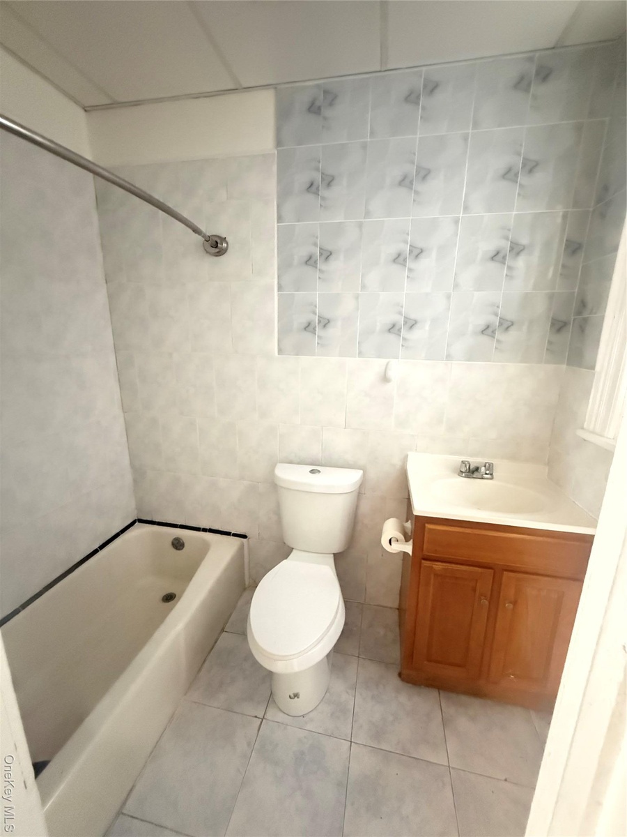 - Bathroom with tile walls, vanity, washtub / shower combination, and light tile patterned floors