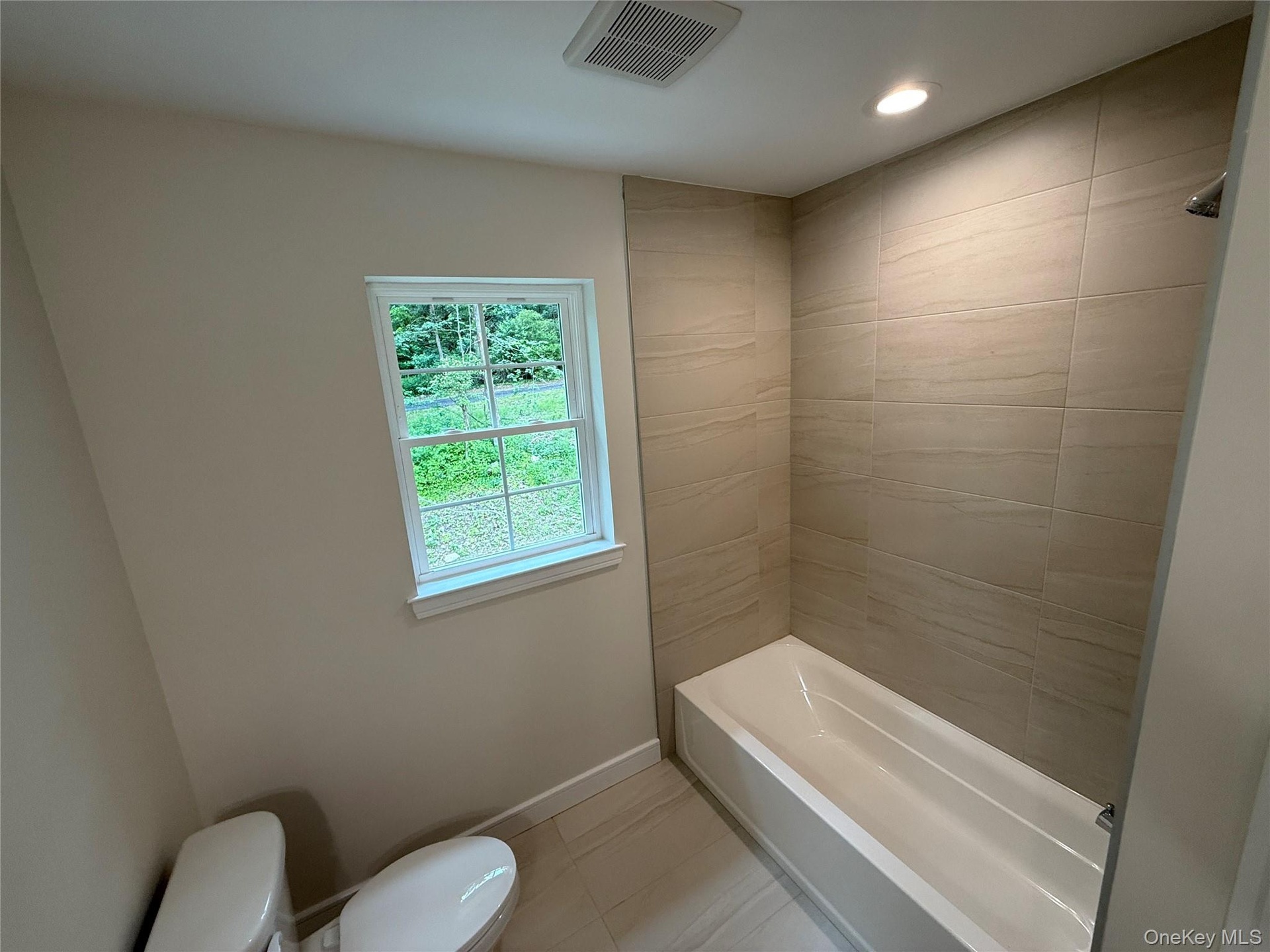 - Full bath with washtub / shower combination, tile patterned floors, and recessed lighting