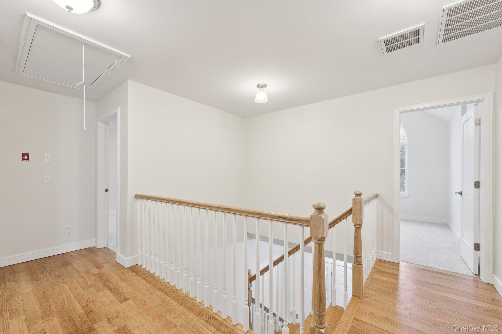 - Hallway featuring attic access, an upstairs landing, and wood finished floors