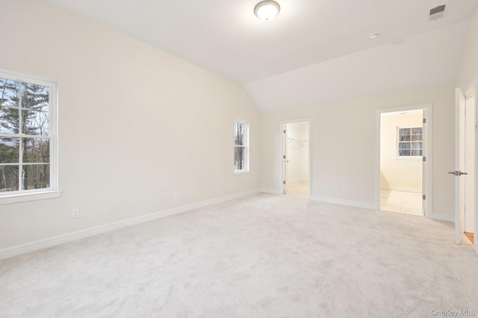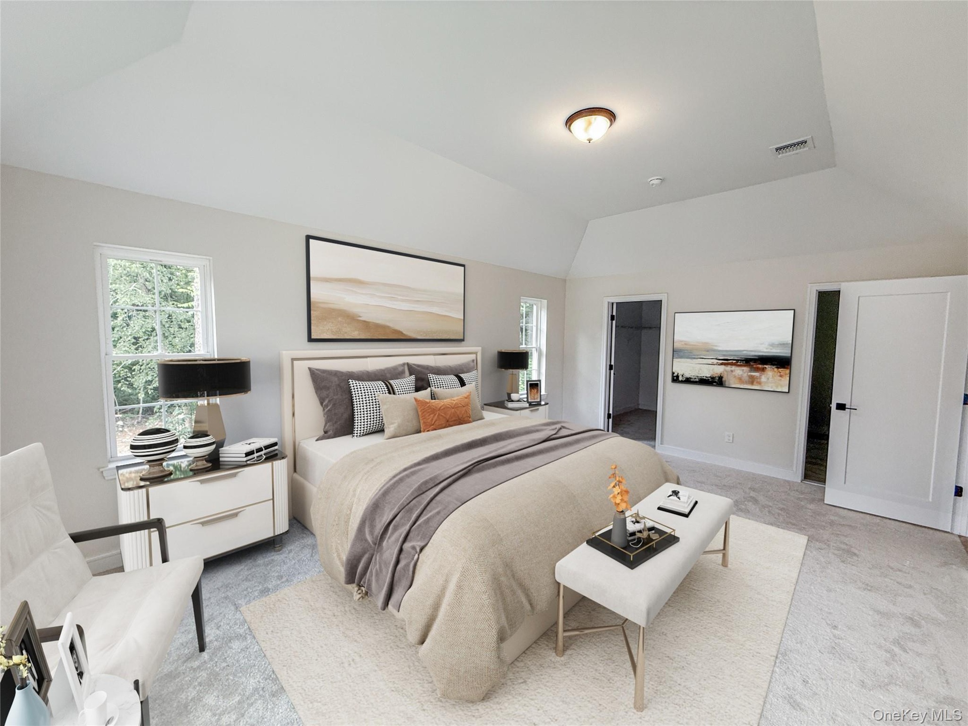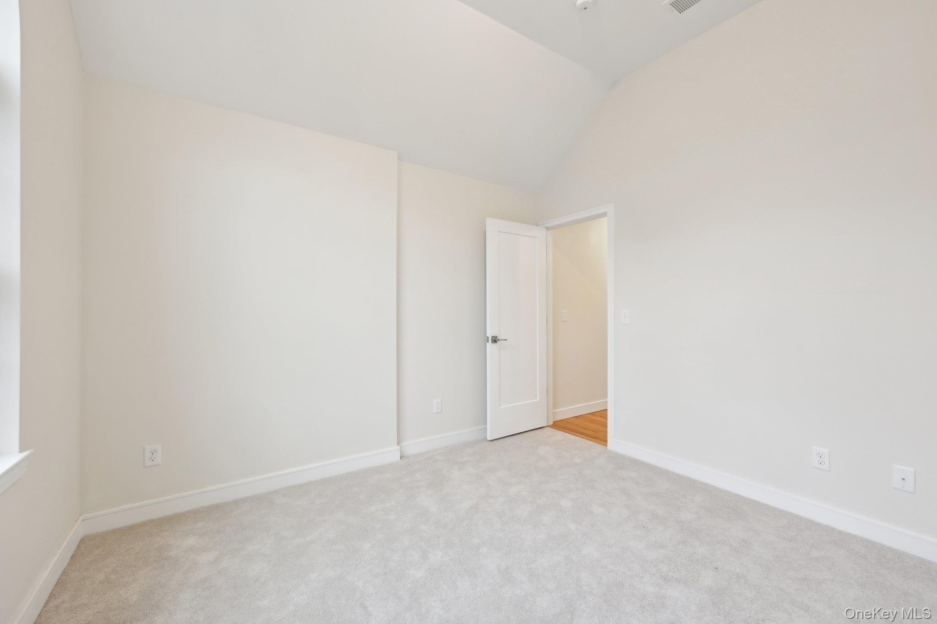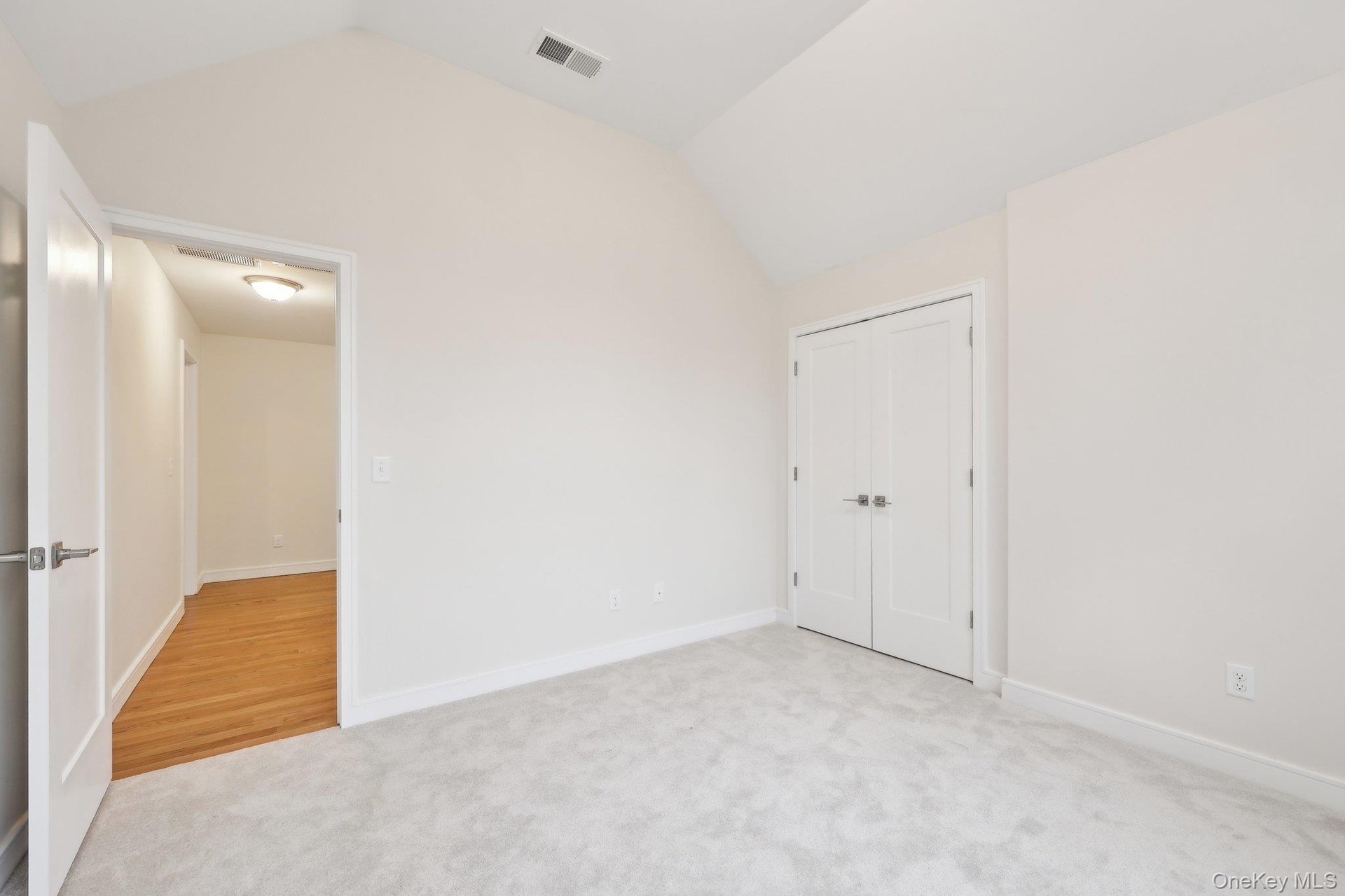 - Unfurnished bedroom with light colored carpet, vaulted ceiling, a spacious closet, and a closet