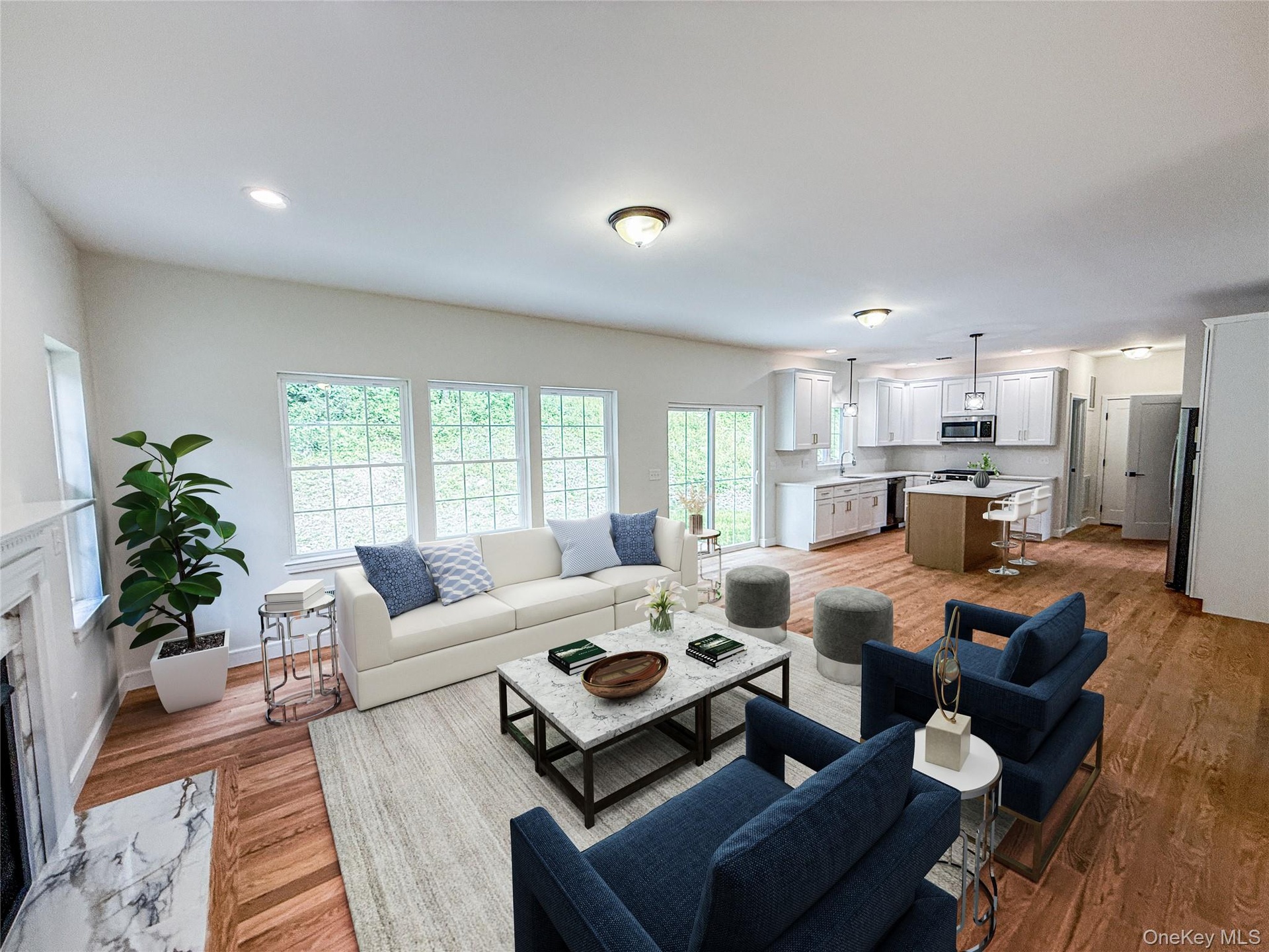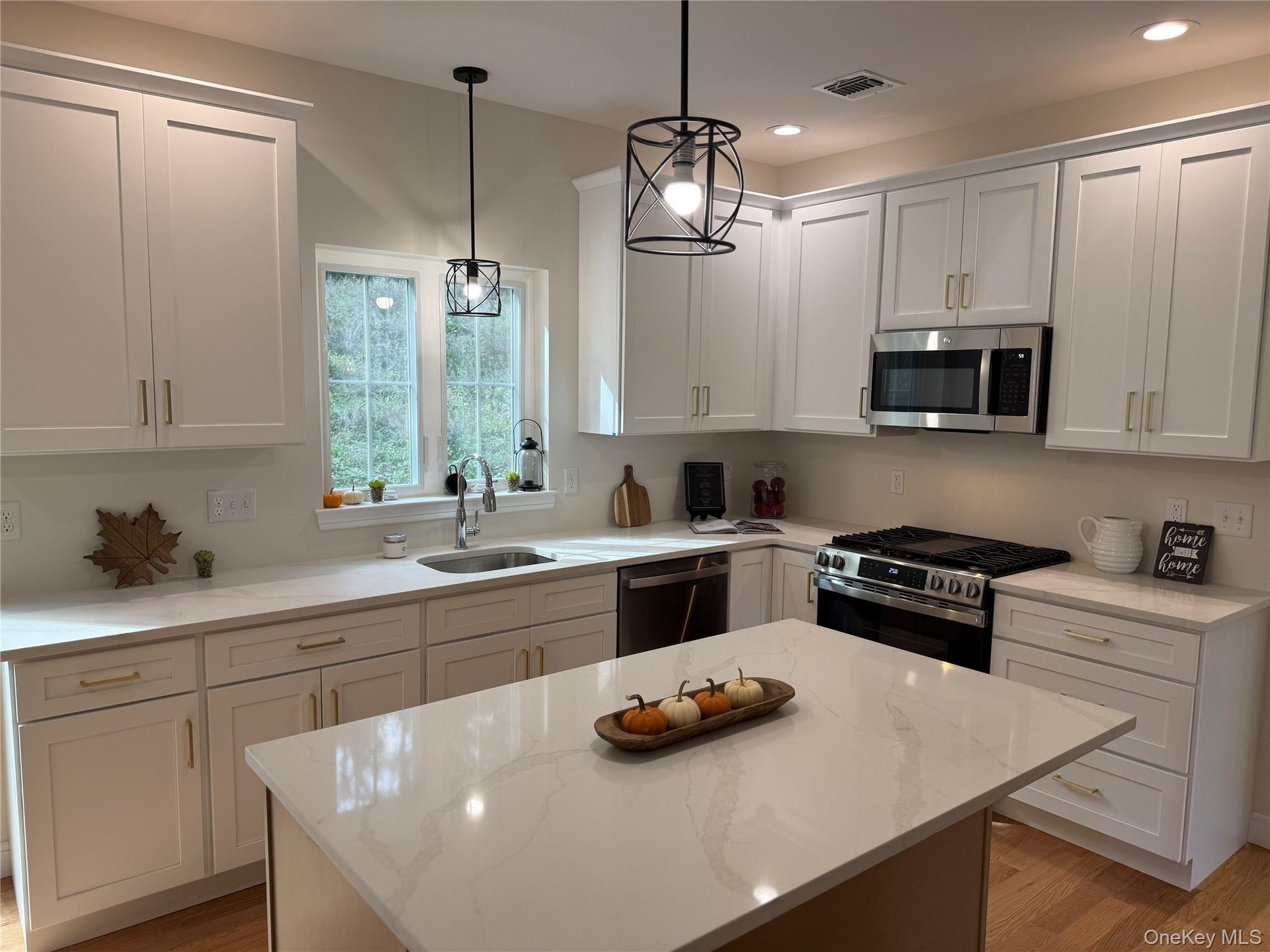 - Kitchen with stainless steel appliances, light wood-style floors, hanging light fixtures, light stone counters, and white cabinets