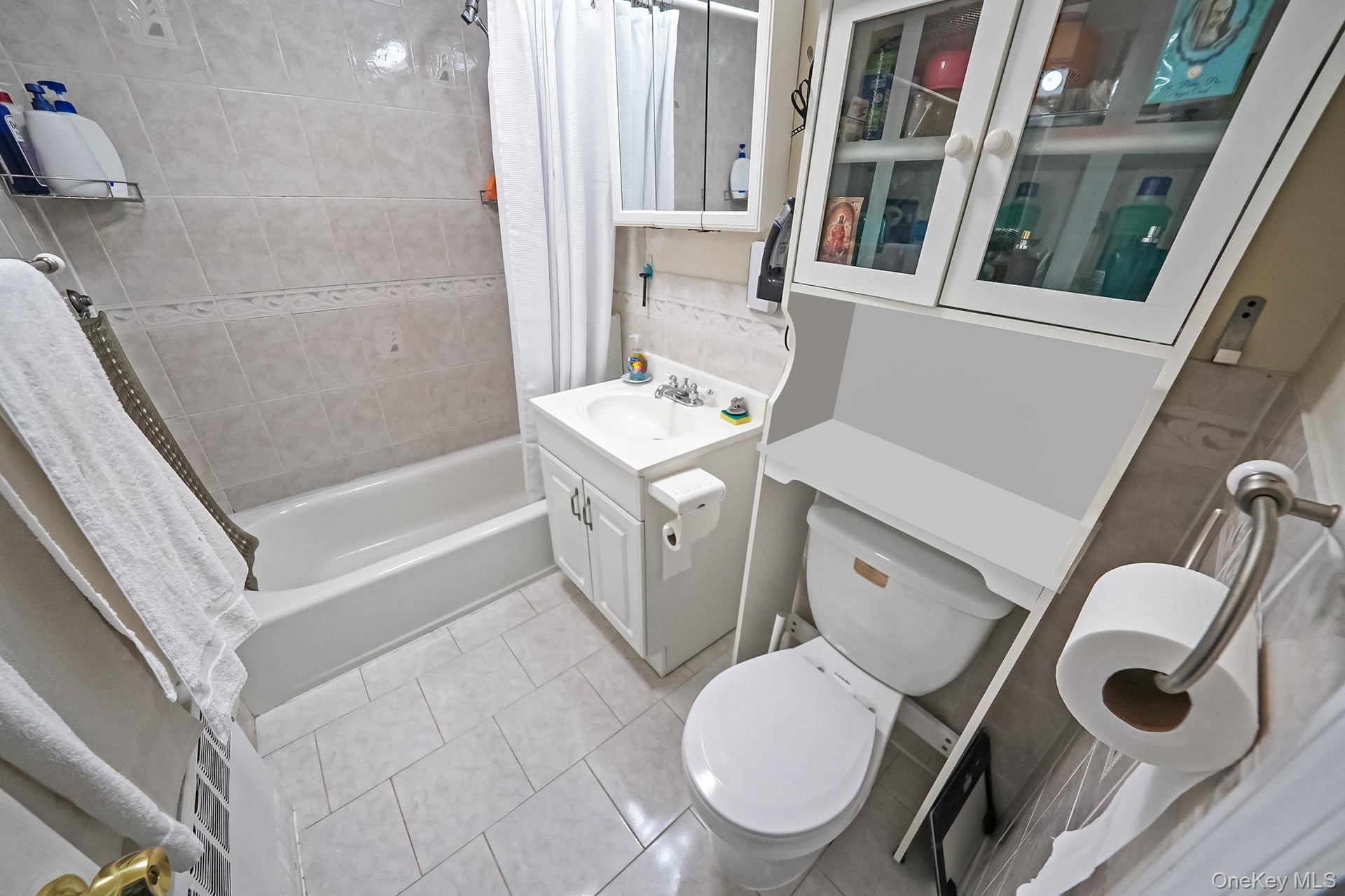 - Bathroom with shower / bath combo, light tile patterned floors, and vanity