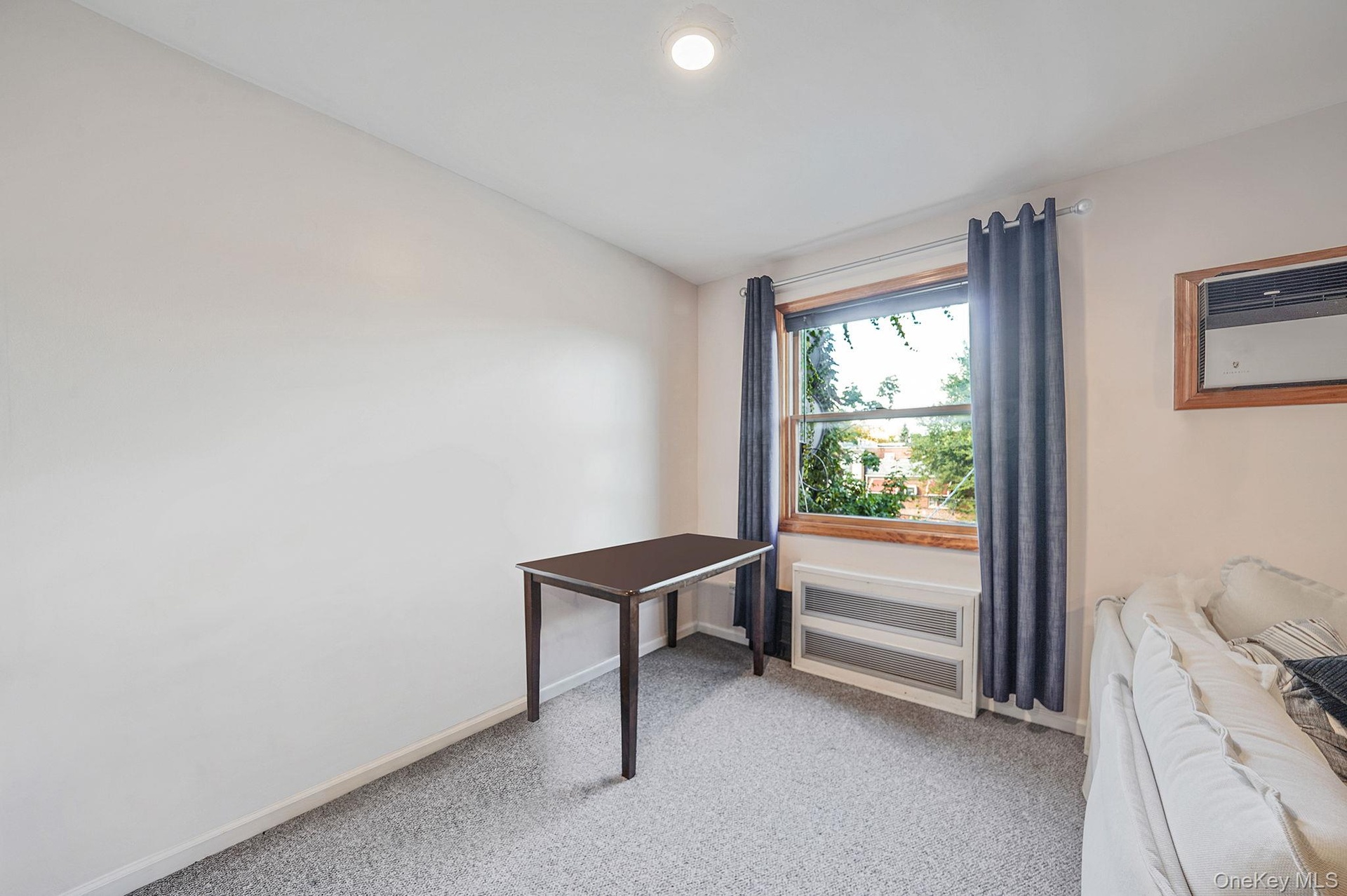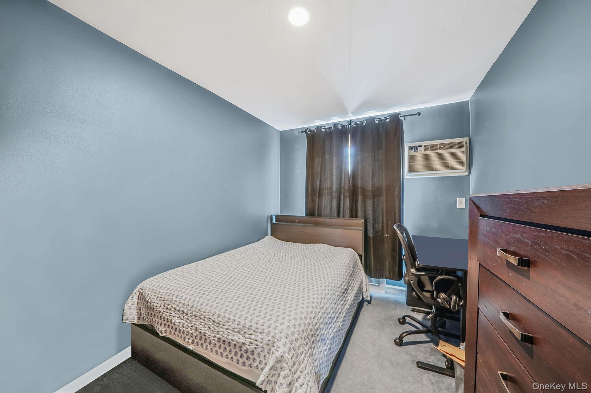 - Carpeted bedroom with baseboards and an AC wall unit