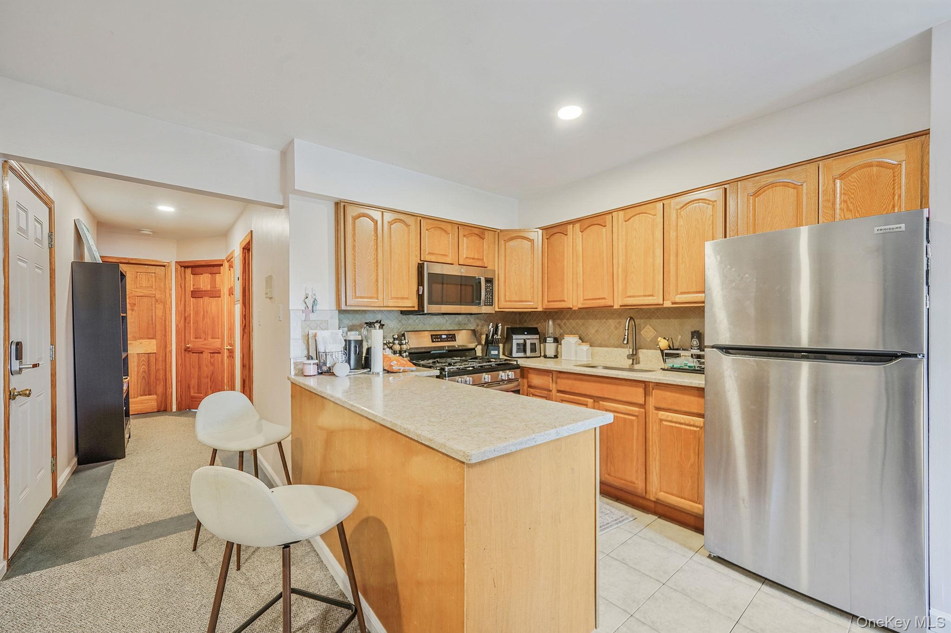 - Kitchen with stainless steel appliances, decorative backsplash, light tile patterned floors, a peninsula, and recessed lighting