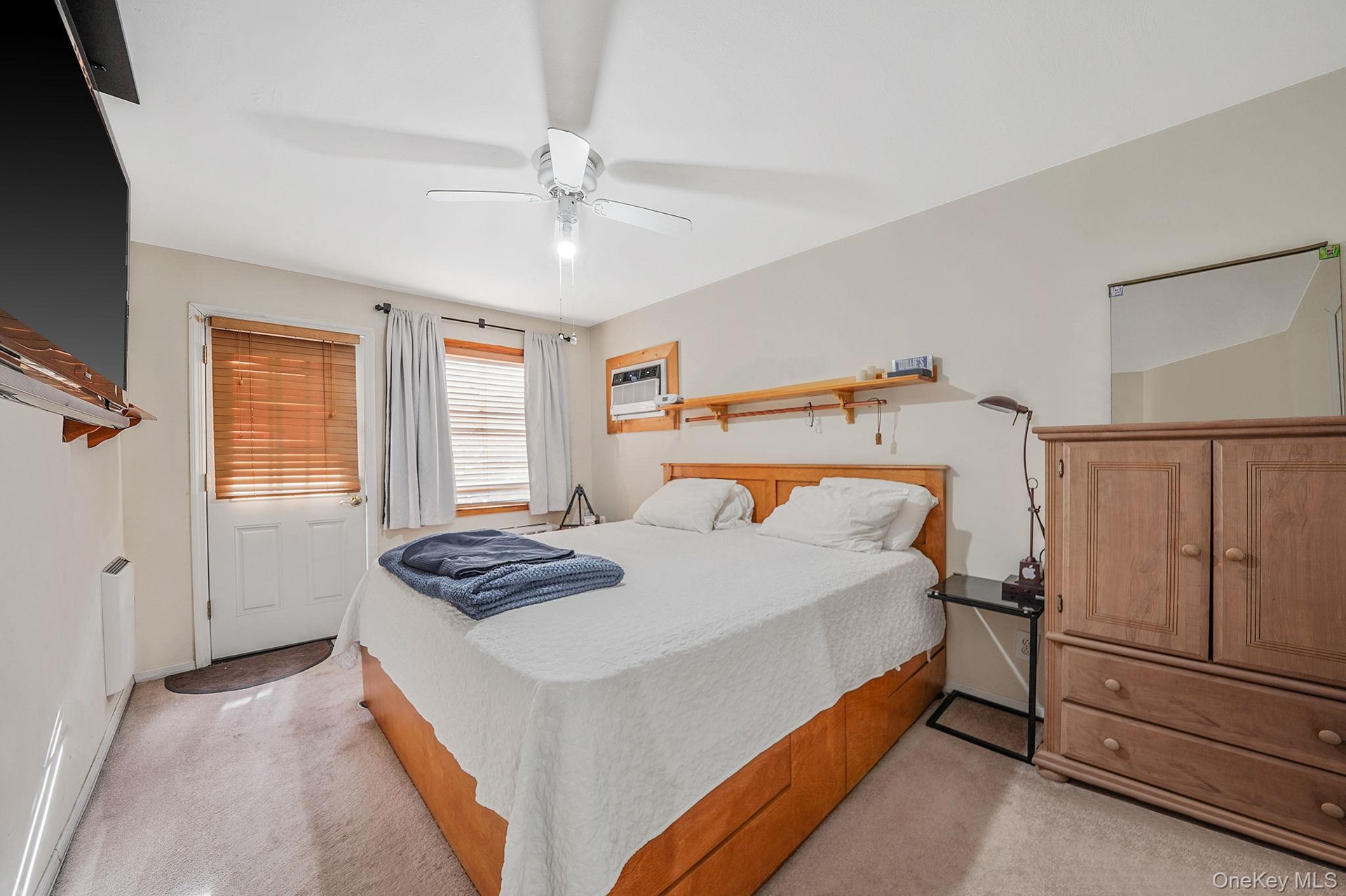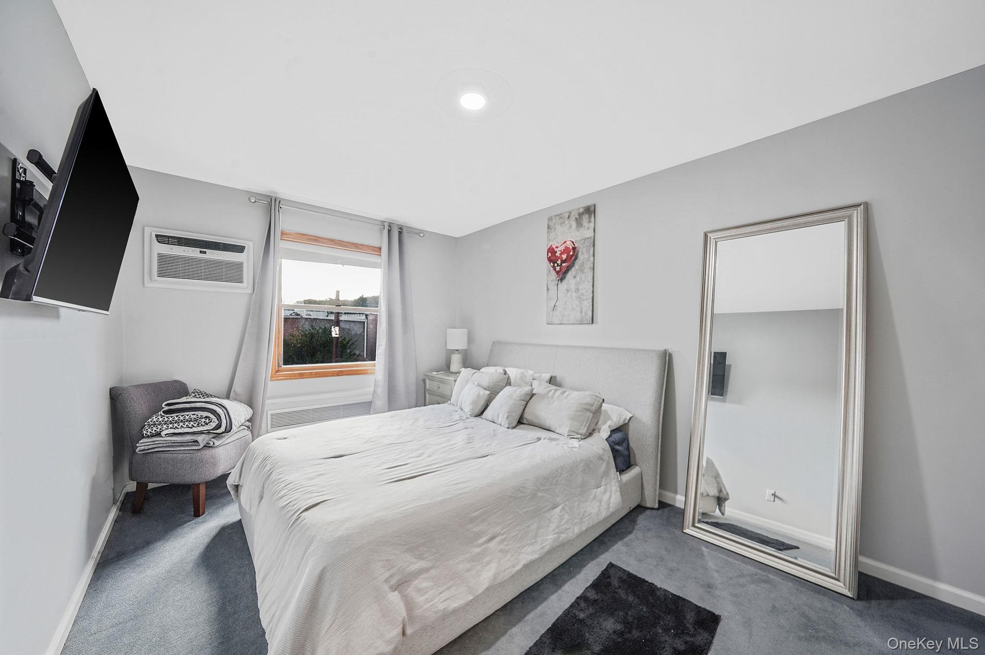 - Bedroom with light colored carpet and a wall mounted AC