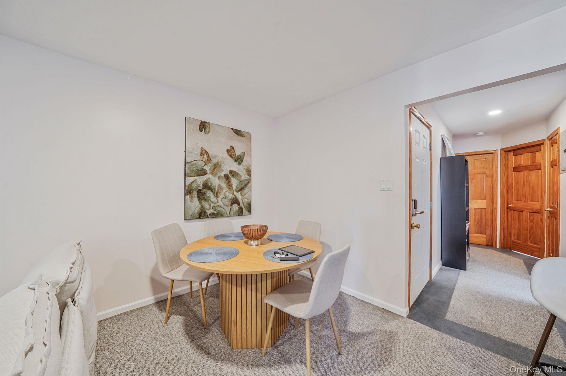 - Dining space with carpet floors and baseboards