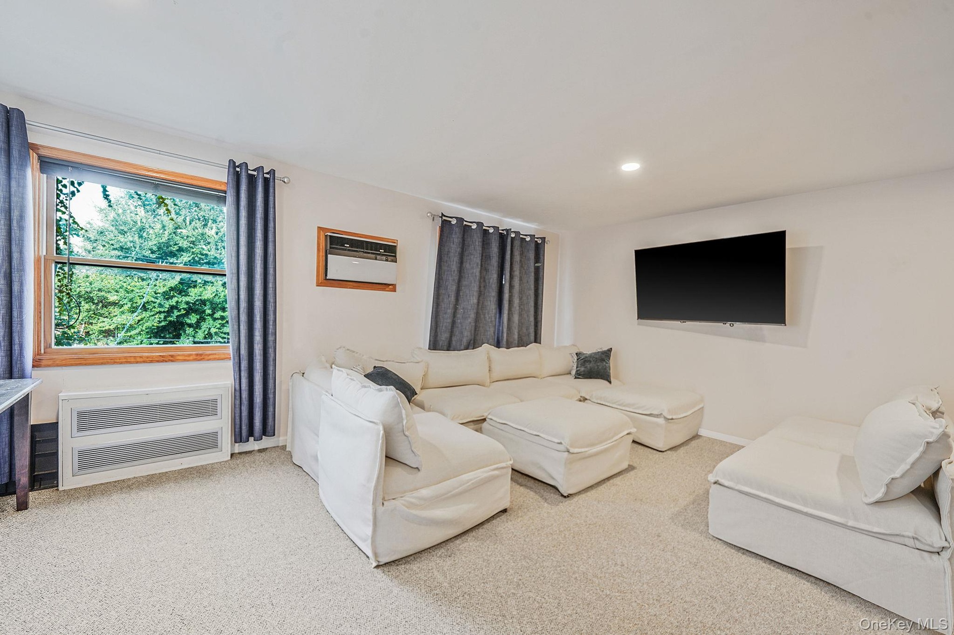 - Living room featuring recessed lighting, carpet flooring, a wall mounted air conditioner, and radiator heating unit