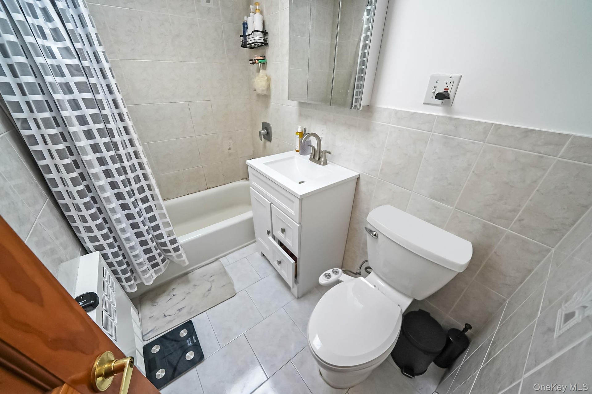 - Full bathroom featuring tile walls, radiator heating unit, vanity, a shower with shower curtain, and wainscoting