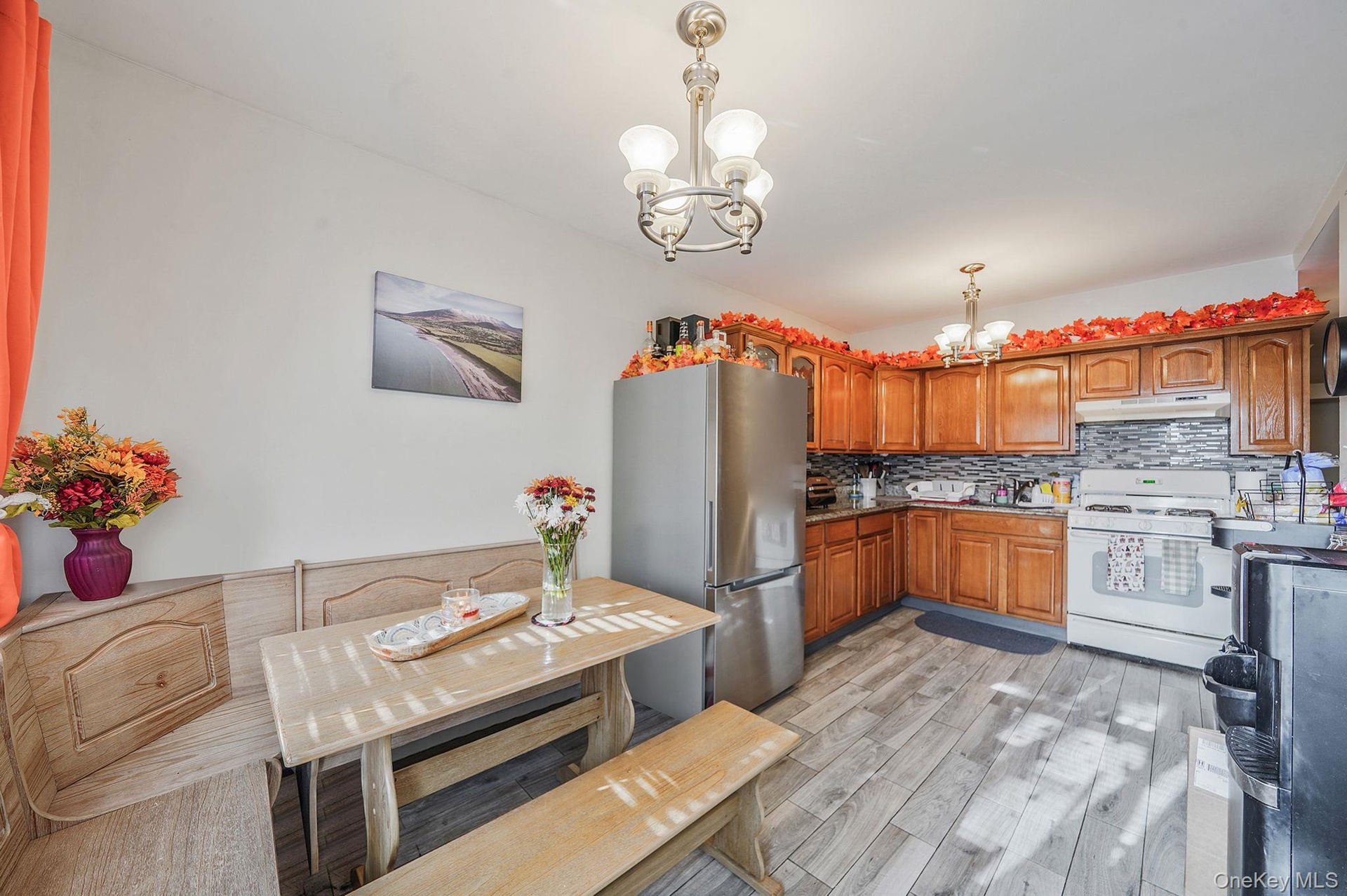 - Kitchen featuring a chandelier, brown cabinetry, freestanding refrigerator, decorative light fixtures, and backsplash