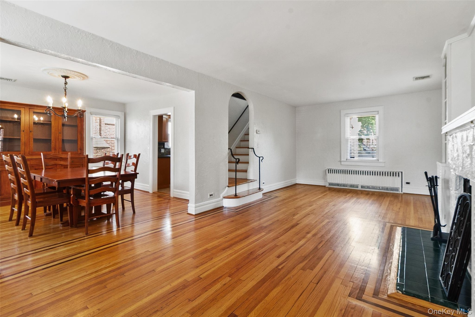 - Dining space featuring light wood-style floors, a chandelier, a fireplace with flush hearth, radiator heating unit, and a baseboard heating unit