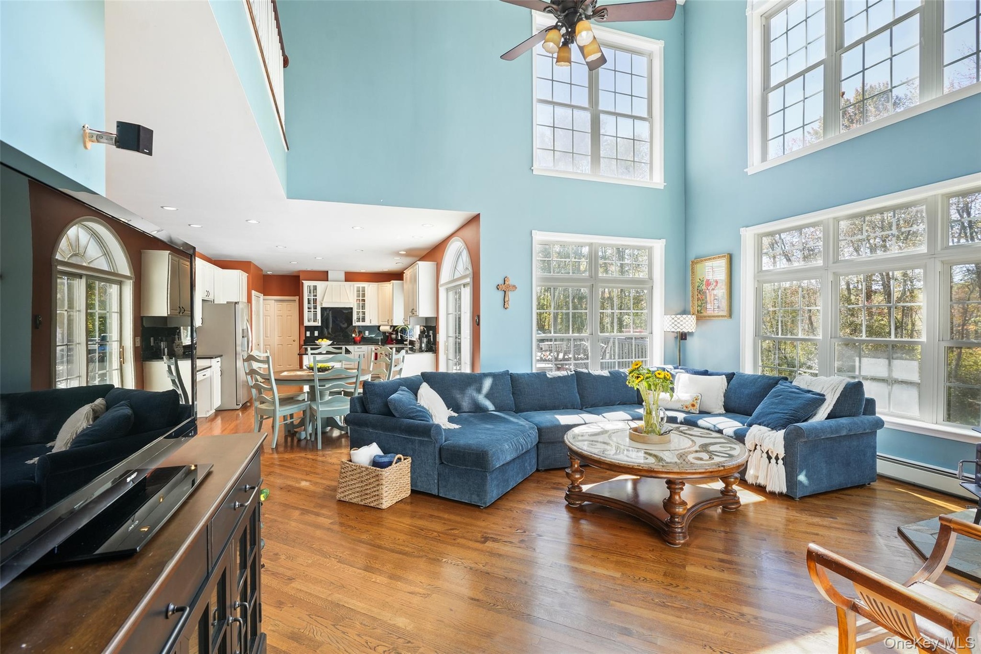 The family room, with its dramatic ceilings and charming wood stove, is a warm and welcoming space where memories are made—whether you're curling up by the fire on a chilly evening or entertaining guests year-round.